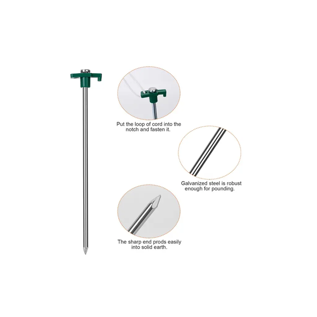 Features: Heavy Duty Construction: Crafted from galvanized steel, these tent pegs are built to withstand tough ground, including dense or rocky soil. They are corrosion-resistant and durable, ensuring long-lasting use. Easy to Use: The sharp end allows for easy insertion into solid earth, while the button head makes pounding the peg into the ground more convenient. Avoid using stones to hammer the pegs, as this may cause damage. Cord Attachment: To attach the ropes, either fasten the cord directly to the peg or loop it through the notch at the top of the peg and tighten for a secure hold. Installation Tip: To properly secure your tent, position the peg at a 60-degree angle to the ground, leaving about 1.6 inches above the surface to make tightening the rope easier. Versatile Use: These heavy-duty stakes are perfect for outdoor activities like camping, securing tarps, canopies, or tents on both hard and soft ground. Specifications: Brand: LakeForest Product Type: Tent Pegs Color: Silver Material: Galvanized Steel, PE, Nylon Peg Size: 9.8 x 1.7 x 0.6 inches (250 x 43 x 15 mm) Peg Weight: 0.18 lbs (81g) Rope Length: 9.8 ft (3 meters) Rope Thickness: 0.1 in (3mm) Rope Weight: 0.04 lbs (17g) Package Size: 12.6 x 7.48 x 2.76 inches (32 x 19 x 7 cm) Package Weight: 5.01 lbs (2273g) Package Includes: 20 x Tent Pegs 4 x 9.8 ft Nylon Ropes