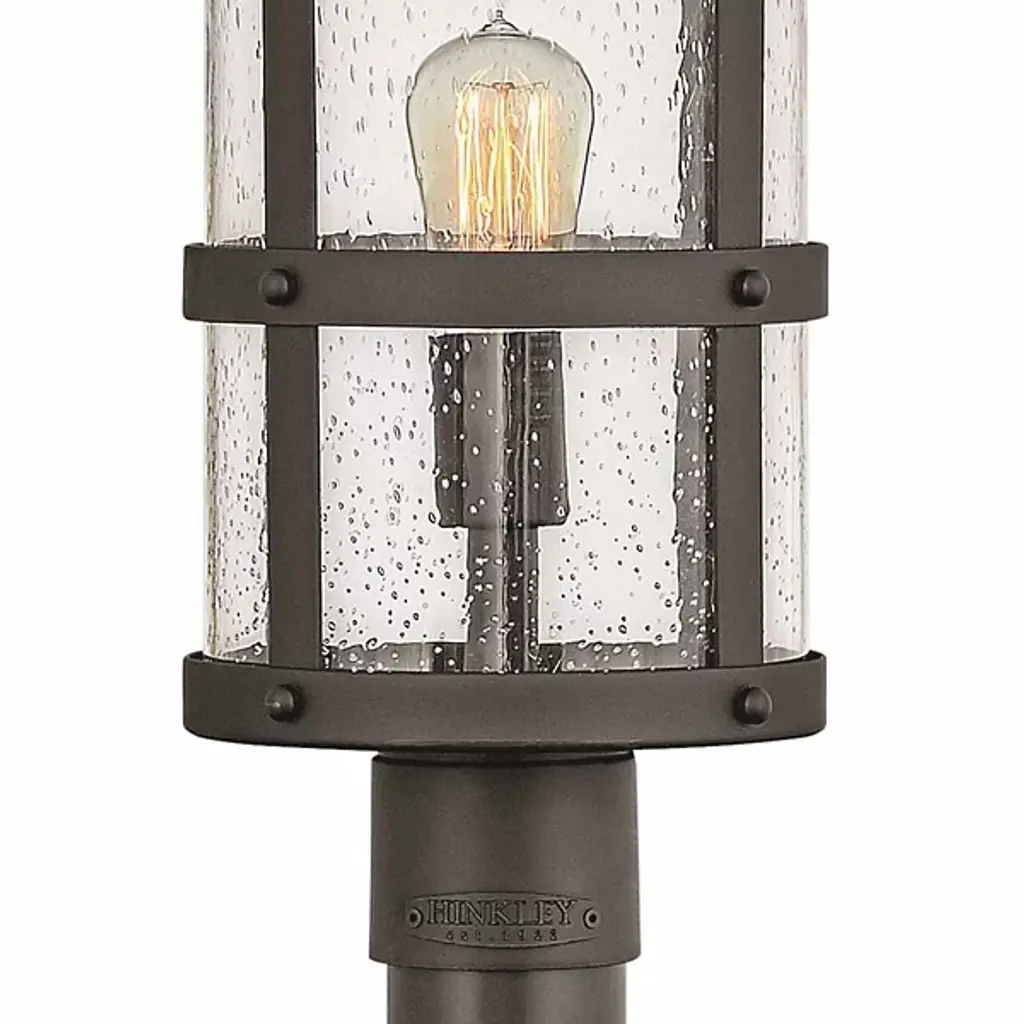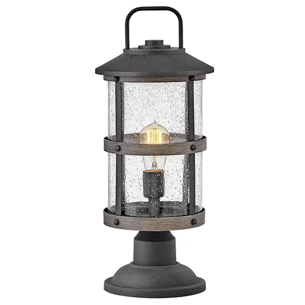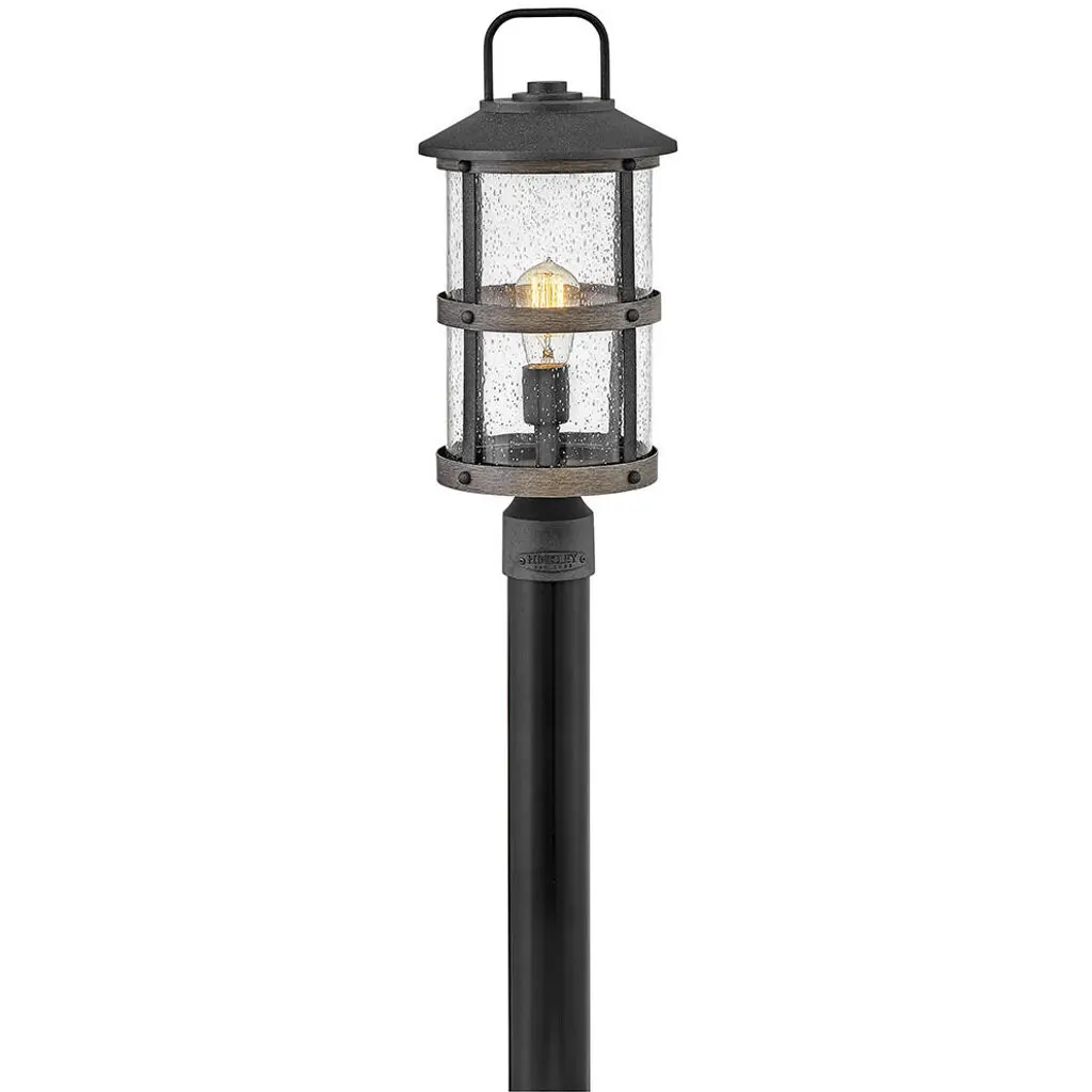 Create a pathway illuminated by a homey silhouette with the timeless design of the Lakehouse Outdoor Post Light from Hinkley Lighting. It's a modern take on the traditional lantern, complete with a charming handle, flaring hood, and rugged metal framework. Like the traditional lantern, its bulb sits safely away from the harshness of the seasons behind a caged design and a cylinder of glass. Warm light from its bulb radiates through the glass, leaving behind a glaze of subtly highlighted bubbles.