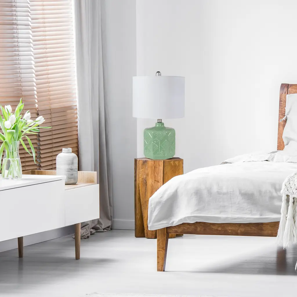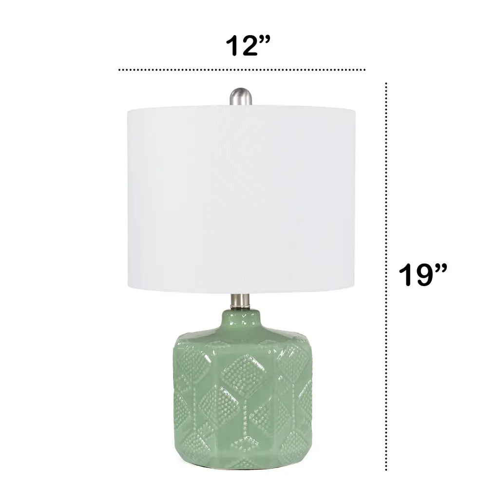 Adorn your space with this beautifully crafted ceramic table lamp. Aesthetically designed with an angular base and embellished with a floral studded texture adding elegance to your space. The white fabric drum shade accents the ochre yellow finish for a clean, fresh look. Perfectly designed for your bedroom nightstand or home office or use as an accent piece in a common area such as your living room or foyer.