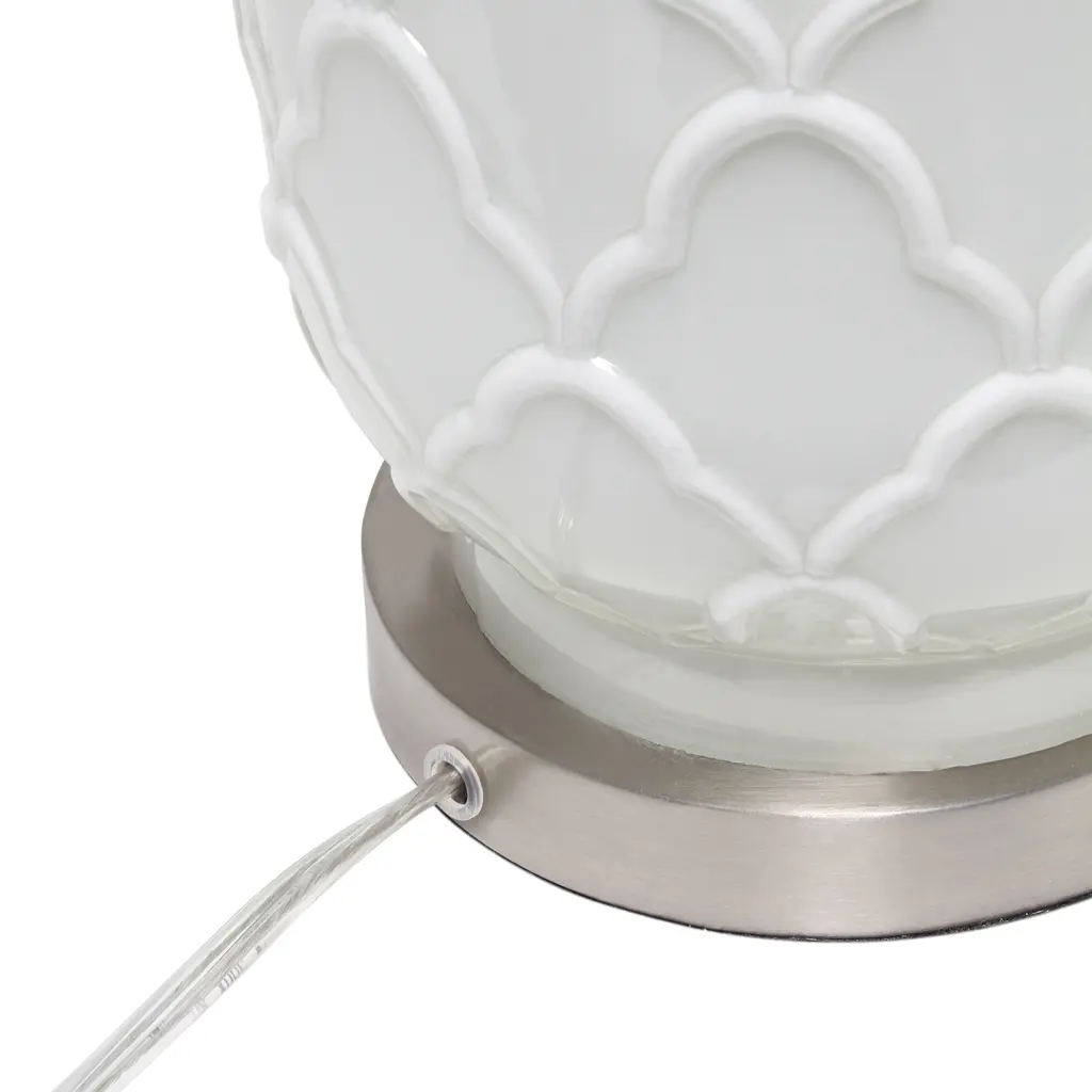 This simple yet sophisticated lamp stands tall at 29.25" and is sure to make a statement in any room in your home. The crisp white glass is delicately designed with a charming pattern and complimented with brushed nickel accents and a fresh white fabric drum shade. Perfect for large foyers, bedrooms, living rooms or offices!
