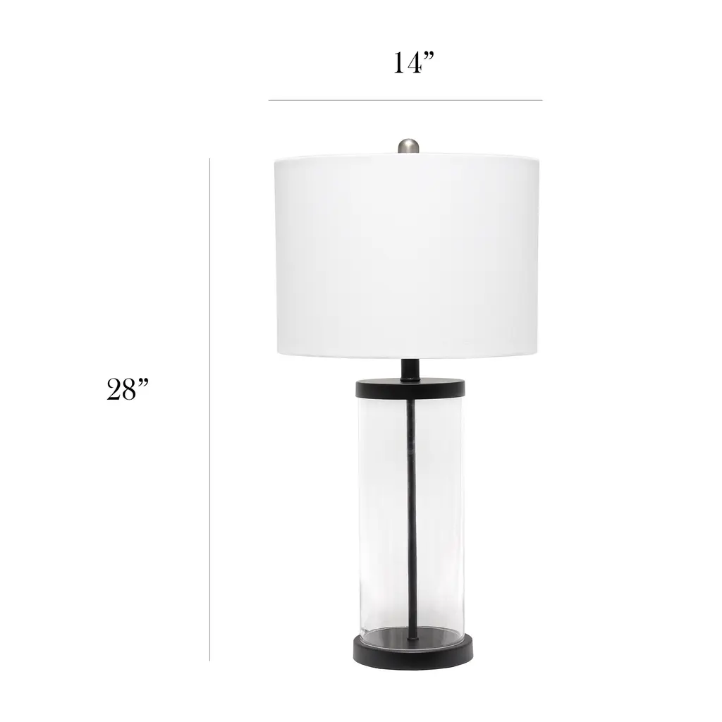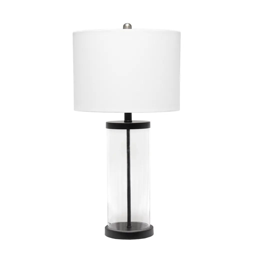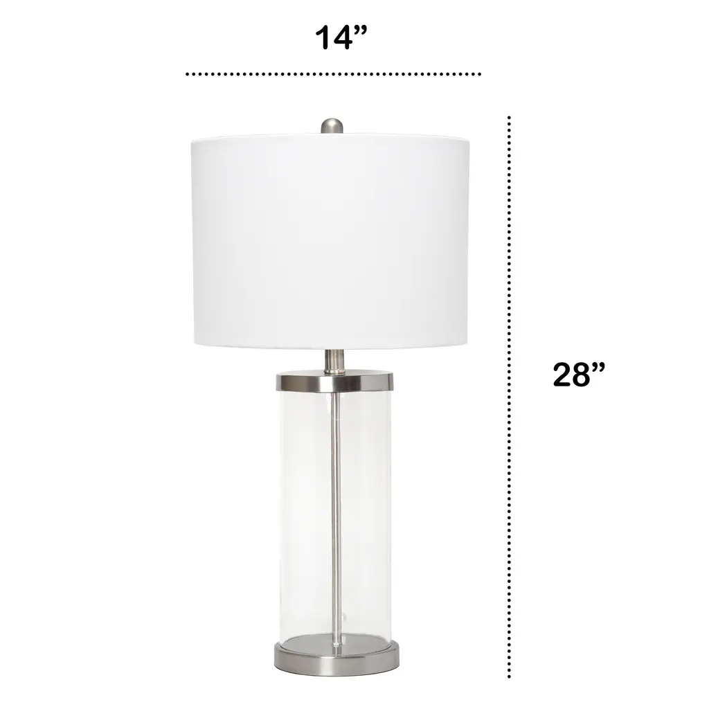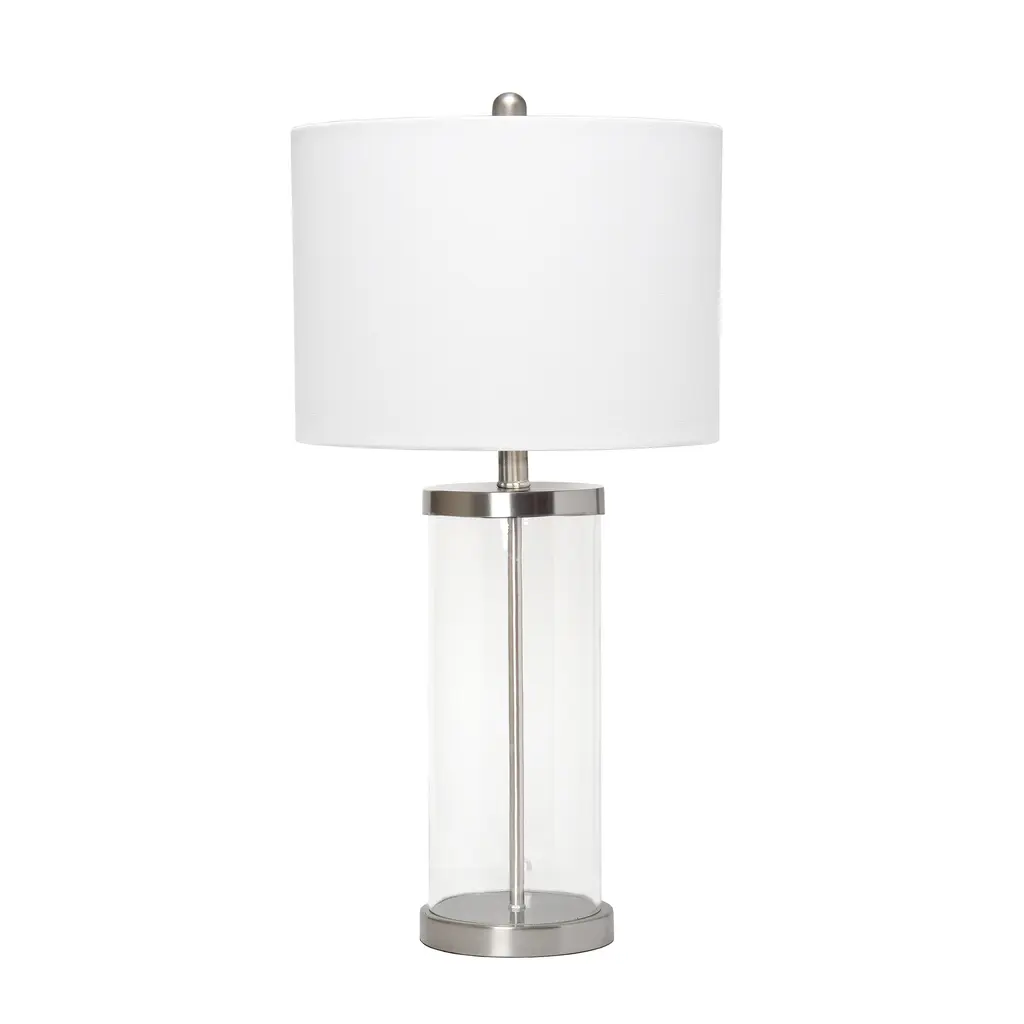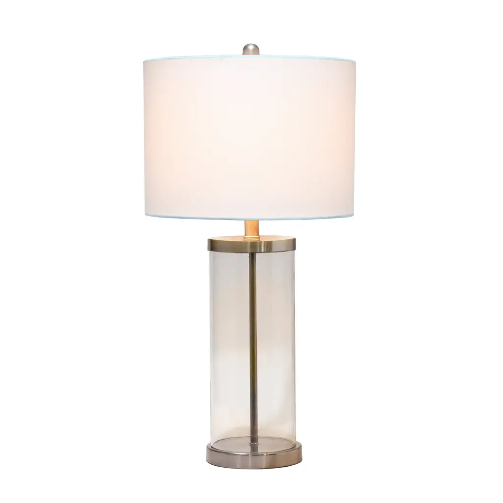 Classic yet contemporary this lamp will light up any room in your home with style! This lamp features a clear glass cylindrical base with brushed nickel metal on top and bottom for a clean, sophisticated look. Perfect for your living room, bedroom, office, or anywhere you need to add a tasteful update!