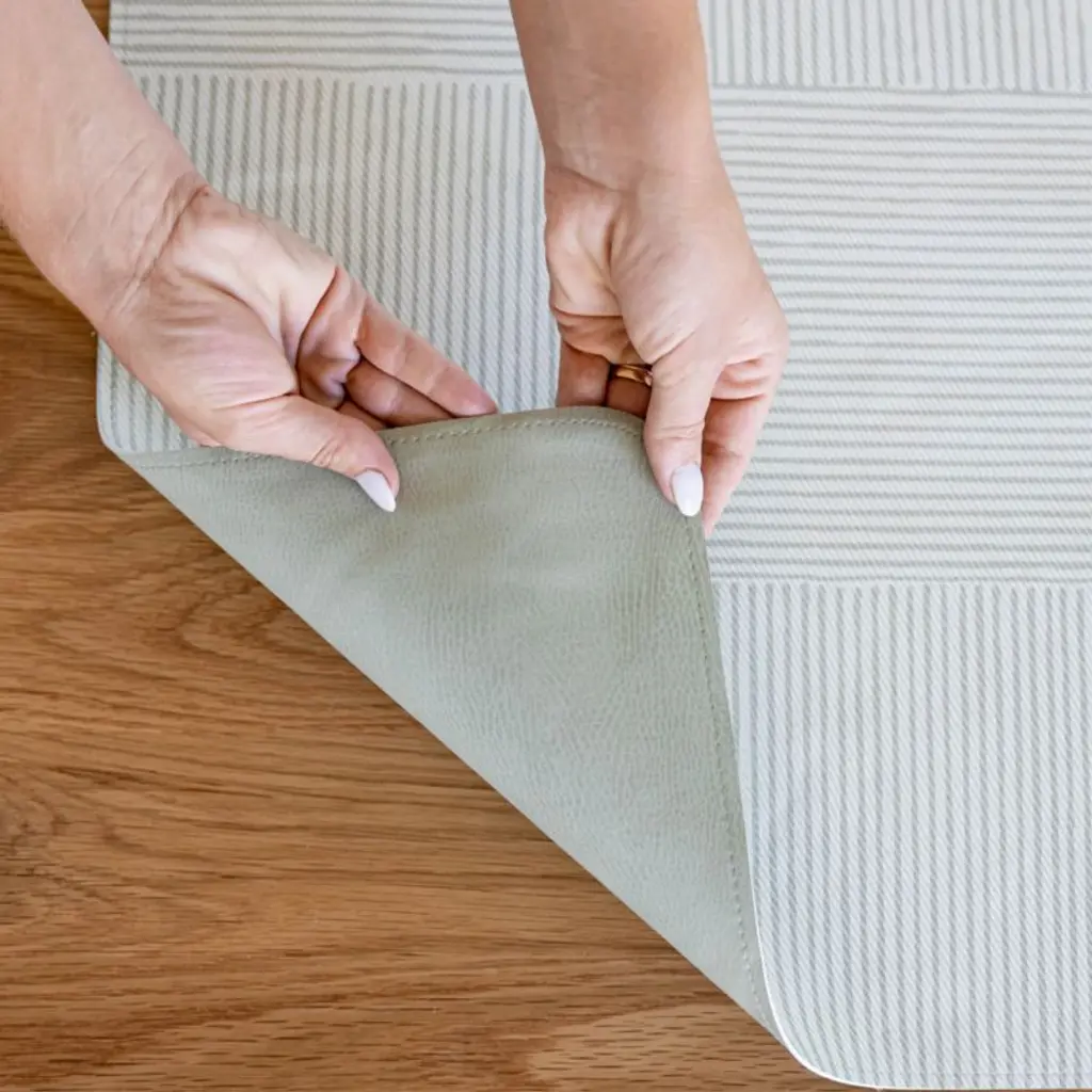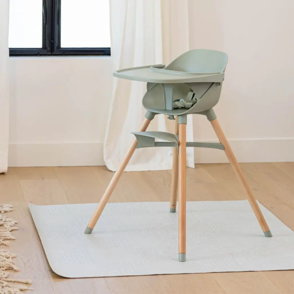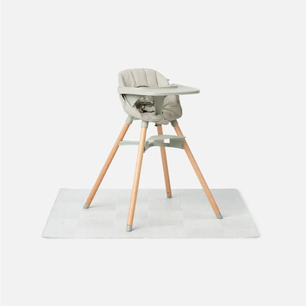 Juice, oatmeal and spaghetti splattersbring it on. The Lalo Splat Mat makes cleanup a breeze and looks good doing it. Designed with both style and functionality in mind, the soft, double-sided vegan leather mat features a modern striped wickerwork design that reverses to a matching solid sage green. Once mealtime or craft time is done, the tough, waterproof fabric can be easily wiped, rinsed or scrubbed. Perfectly sized to fit under Lalo The Chair (not included).