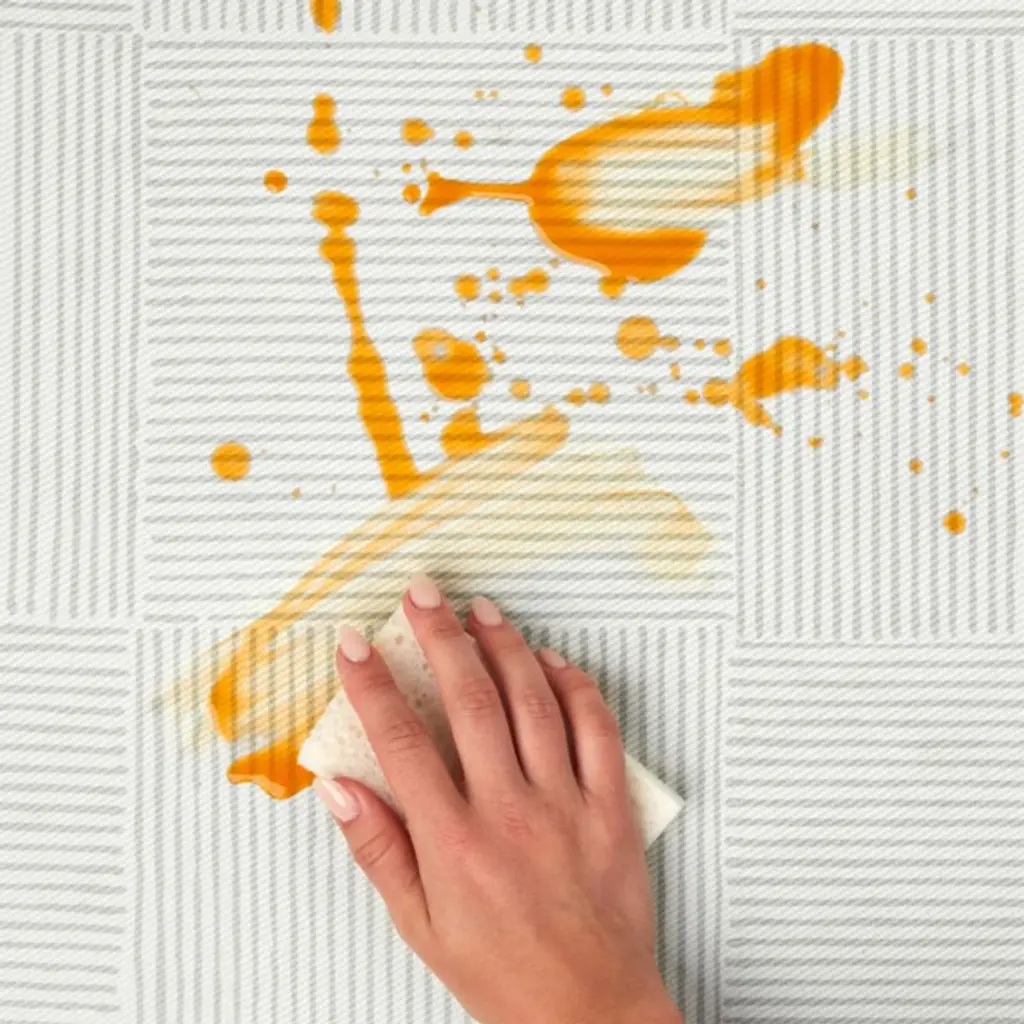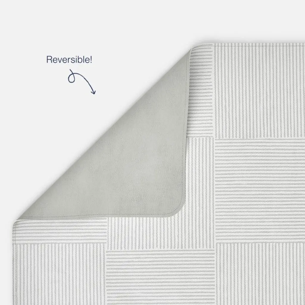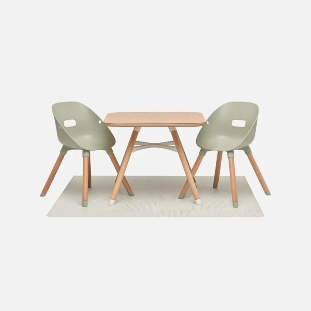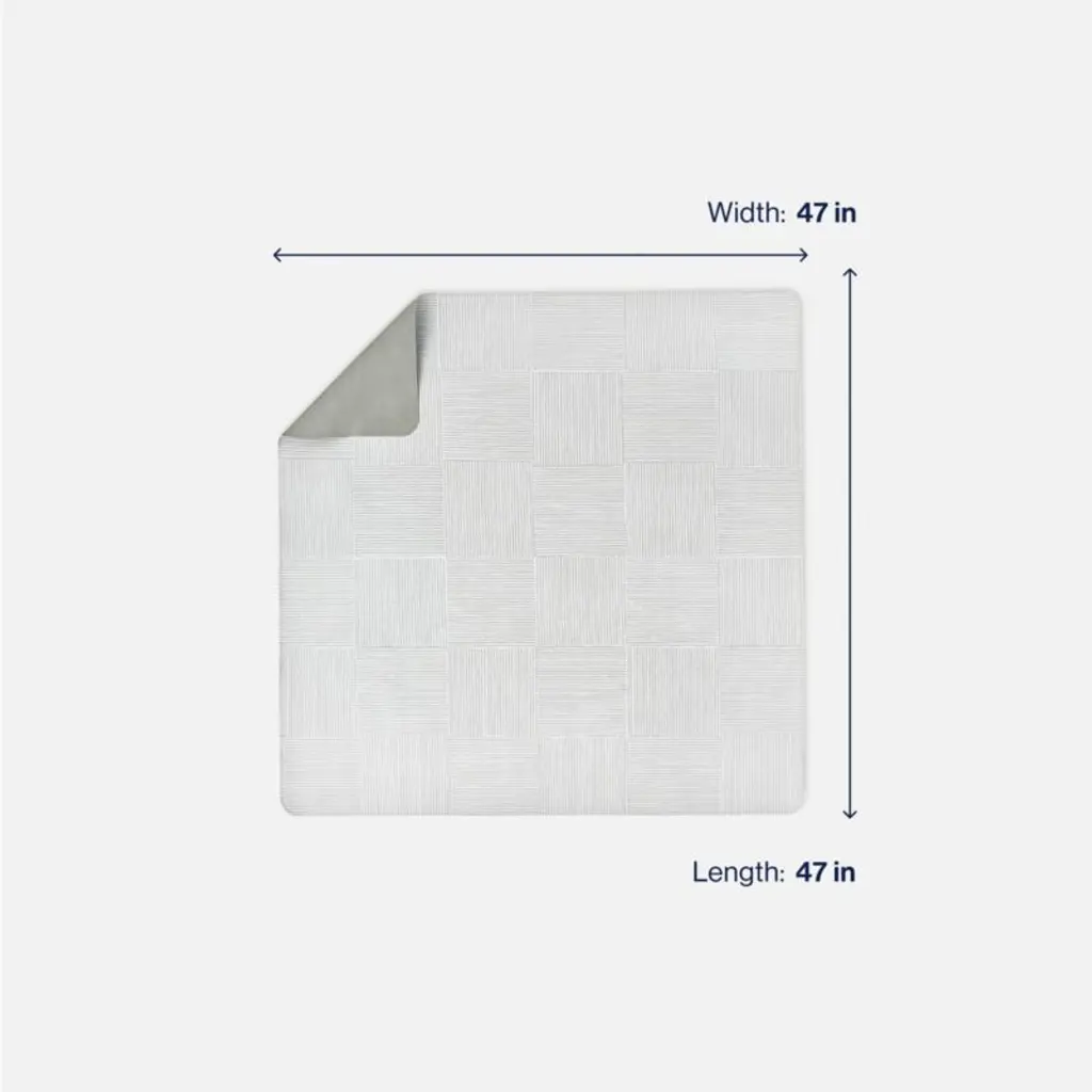 Juice, oatmeal and spaghetti splattersbring it on. The Lalo Splat Mat makes cleanup a breeze and looks good doing it. Designed with both style and functionality in mind, the soft, double-sided vegan leather mat features a modern striped wickerwork design that reverses to a matching solid sage green. Once mealtime or craft time is done, the tough, waterproof fabric can be easily wiped, rinsed or scrubbed. Perfectly sized to fit under Lalo The Chair (not included).