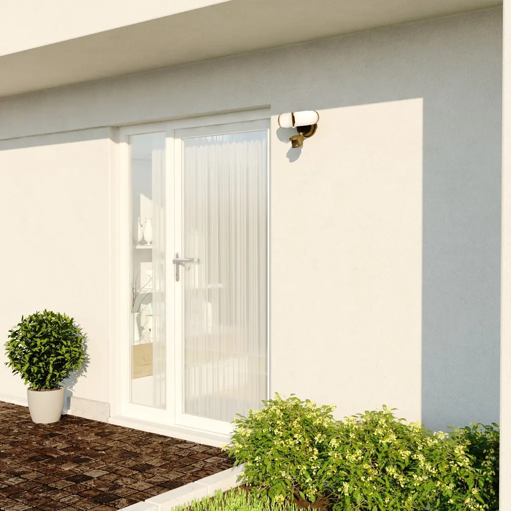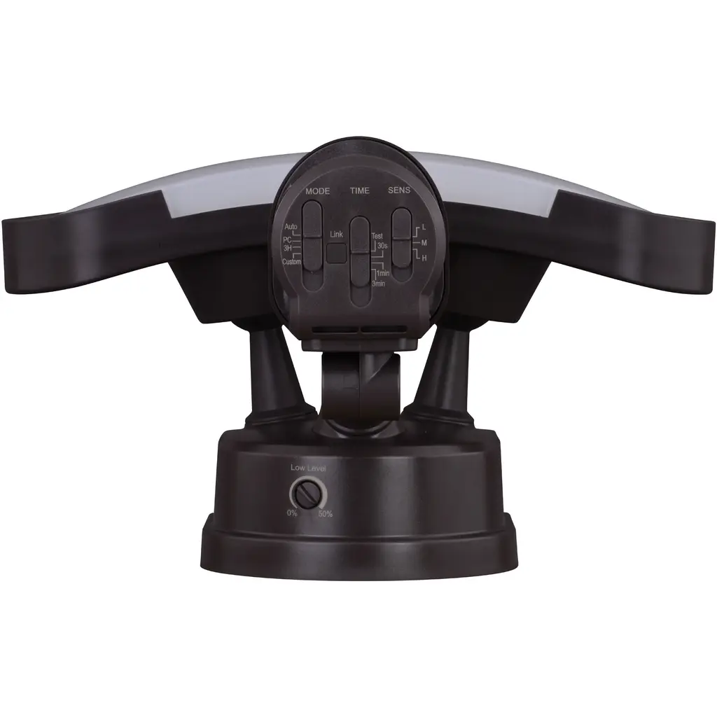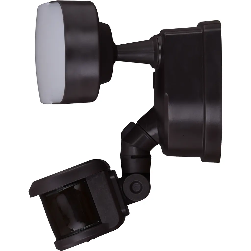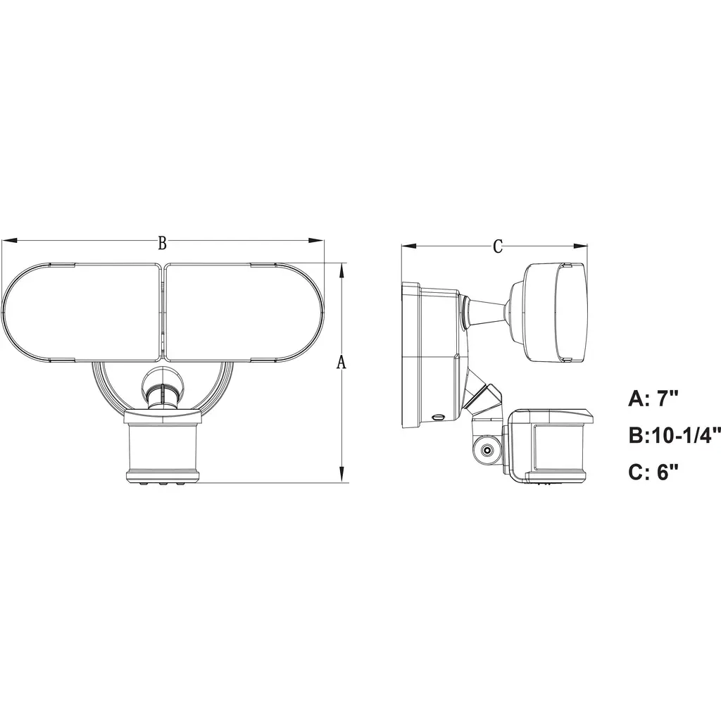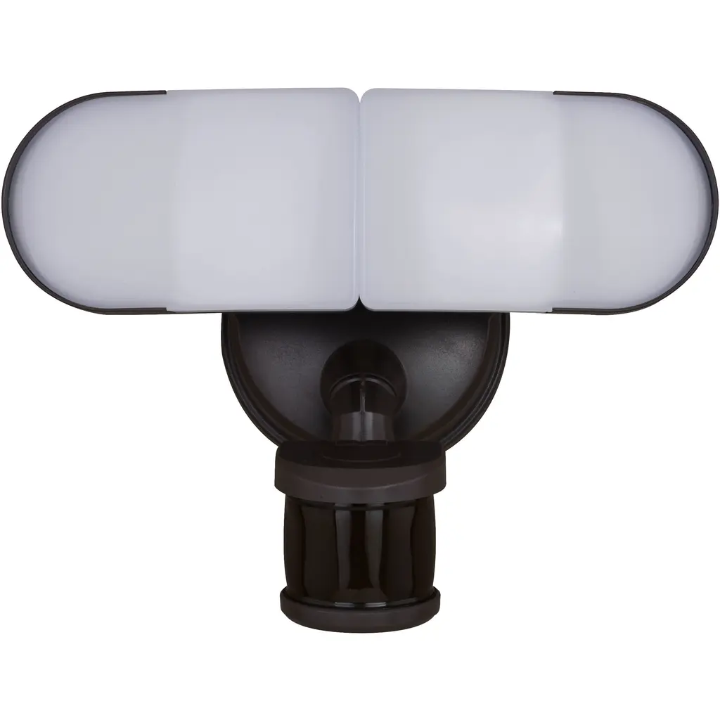 The bronze 2-light Lambda LED outdoor motion sensor security flood light provides the ability to connect multiple security lights into a sync group, so if one in the group detects motion, all will engage with 5000K high level bright light. The modern light heads are fully adjustable and deliver 2,600 lumens to keep your home's exterior brighter at dusk, dimmer with 2700K at night, and instantly bright 5000K when motion is detected. This sync-able dualux security light expands the functionality, safety, and security of your home's outdoor spaces with bright, reliable light when and where it is needed.