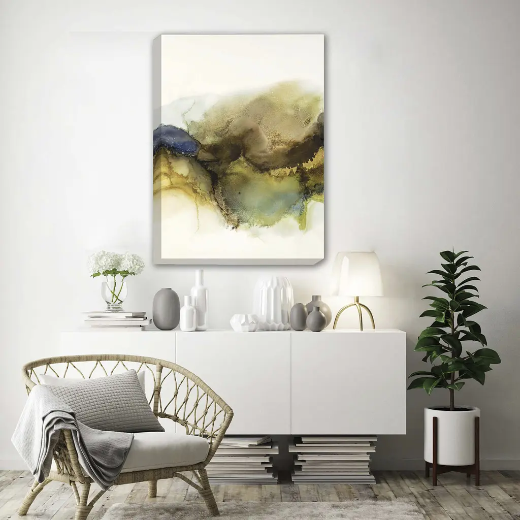 An abstract in shades of teal and yellow converge in swirling colors. Gallery style canvas is wrapped around wood stretcher bars.