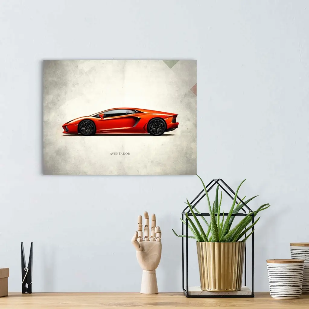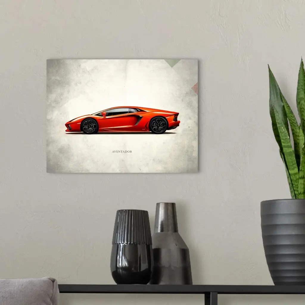 Photograph of a red Lamborghini Aventador printed on a distressed white and gray background with part of the Italian flag in the top right corner.