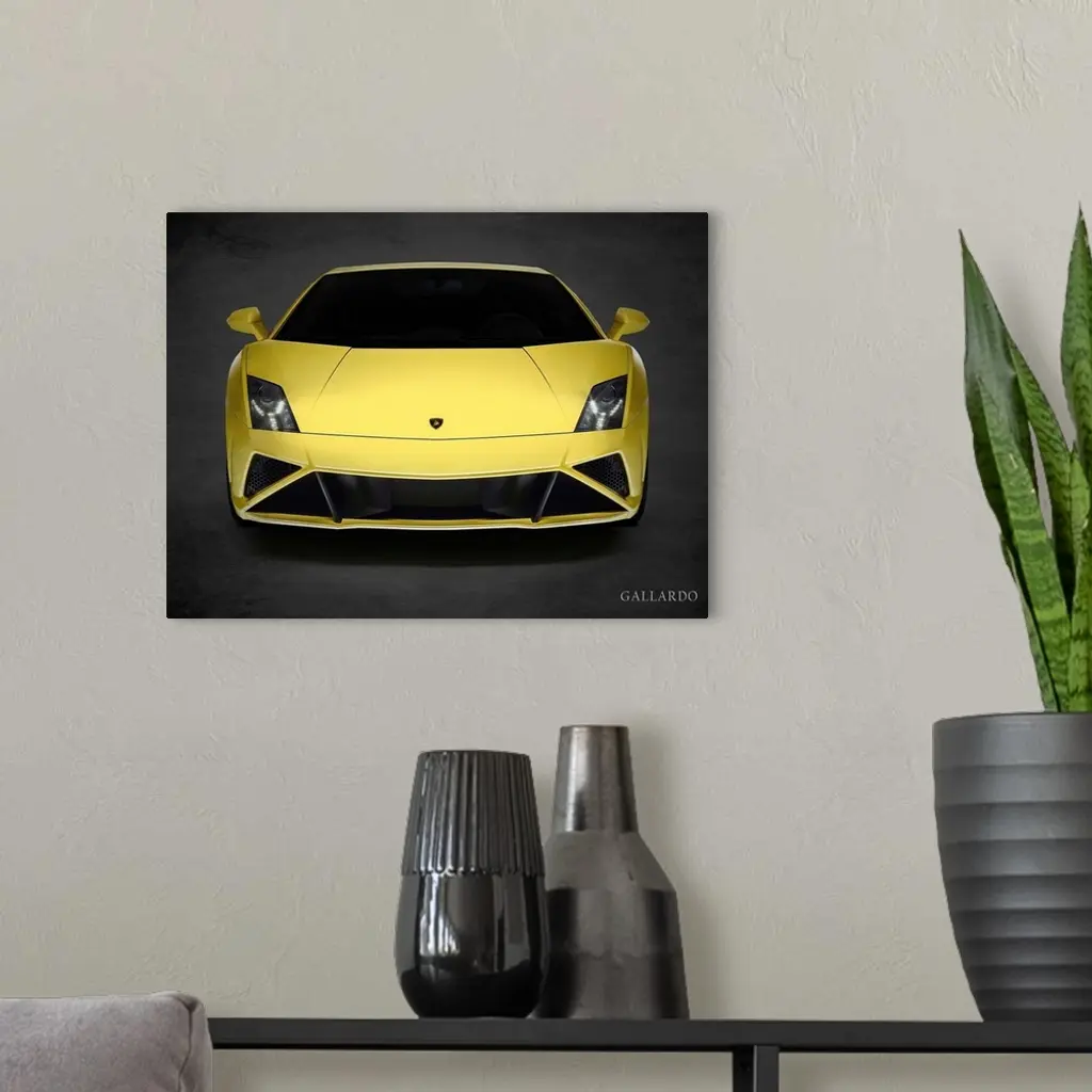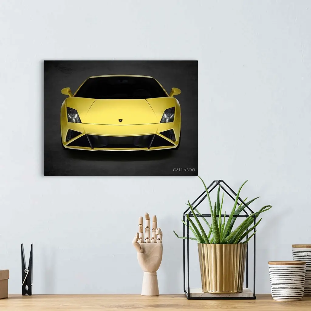 Photograph of a yellow Lamborghini Gallardo LP-560 printed on a black background with a dark vignette.