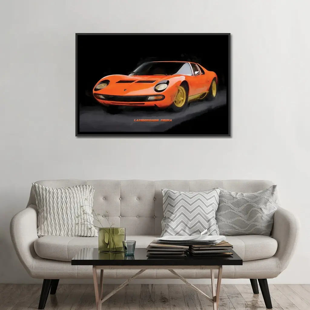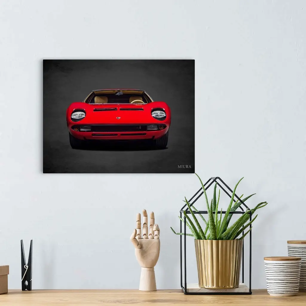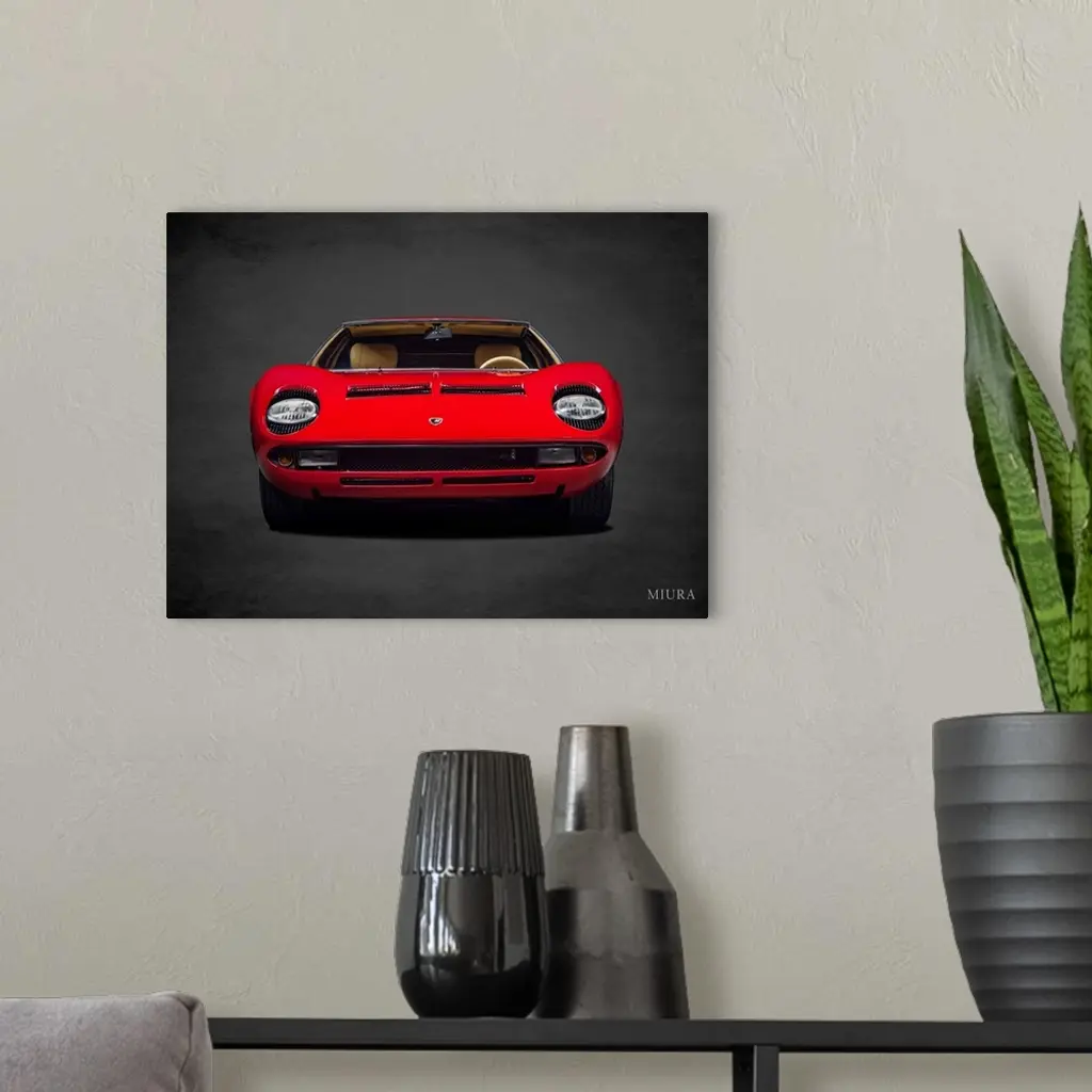 Photograph of a red Lamborghini Miura printed on a black background with a dark vignette.