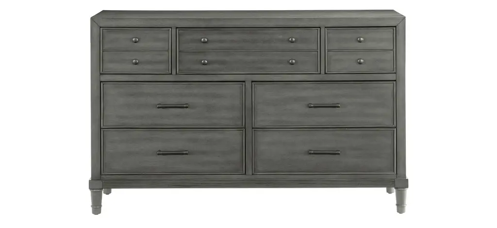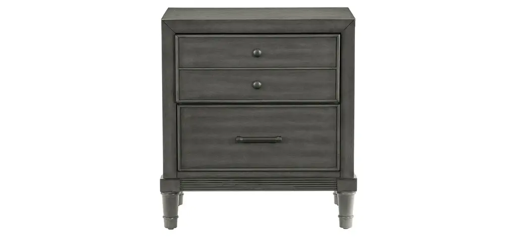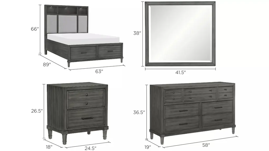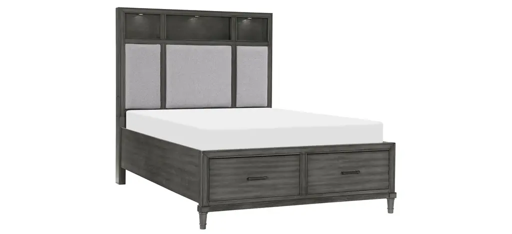 Modern convenience is paired with transitional style to create the versatile look of the Lana Bed. The multi-functional design of the bed allows for convenient storage within the footboard drawers, charging capability by way of the mounted USB ports, as well as display and illumination within the touch-engaged LED-lit open fronted bookshelves of the headboard. The bed's headboard also features pebble gray hued fabric inserts creating complementing contrast to the collections gray finish over okume veneer. Dark bronze finished knob and bar hardware front the drawers of the footboard.