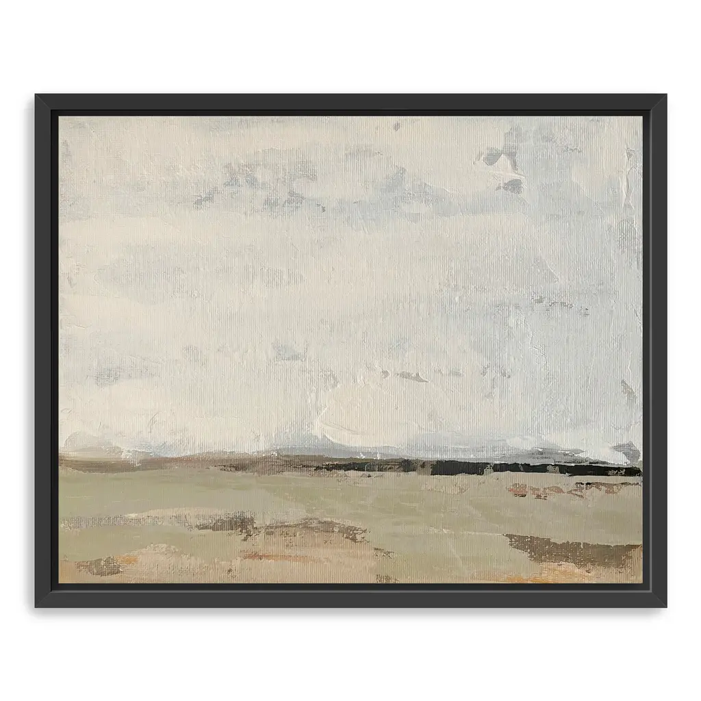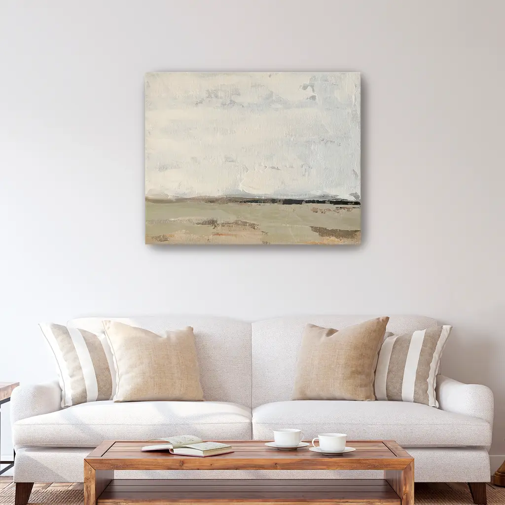 Add a touch of elegance to your home with the "Land And Sky III" canvas art print by Haley Knighten. This piece features soothing neutral earthy tones that blend harmoniously, creating a serene and sophisticated atmosphere. Its abstract landscape design enhances both contemporary and classic interiors alike. Available in black frame, dark walnut frame, oak frame, or as a wrapped canvas. Our Gallery Wrap Canvas Prints are proudly assembled with high quality materials in California, USA. Each piece is printed on a thick, archival grade canvas using Giclee technology. It is then hand-stretched by our experienced artisans over solid wood bars, which will not warp over time. The final product is a piece personally crafted for you to confidently display on your wall. Care and Assembly: Ensure that the location of your piece has little to no exposure to heat, sunlight, and moisture. Wipe clean, only if needed. Each piece includes a sawtooth hanger to hang on your wall horizontally.