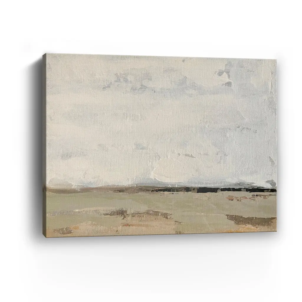 Add a touch of elegance to your home with the "Land And Sky III" canvas art print by Haley Knighten. This piece features soothing neutral earthy tones that blend harmoniously, creating a serene and sophisticated atmosphere. Its abstract landscape design enhances both contemporary and classic interiors alike. Available in black frame, dark walnut frame, oak frame, or as a wrapped canvas. Our Gallery Wrap Canvas Prints are proudly assembled with high quality materials in California, USA. Each piece is printed on a thick, archival grade canvas using Giclee technology. It is then hand-stretched by our experienced artisans over solid wood bars, which will not warp over time. The final product is a piece personally crafted for you to confidently display on your wall. Care and Assembly: Ensure that the location of your piece has little to no exposure to heat, sunlight, and moisture. Wipe clean, only if needed. Each piece includes a sawtooth hanger to hang on your wall horizontally.