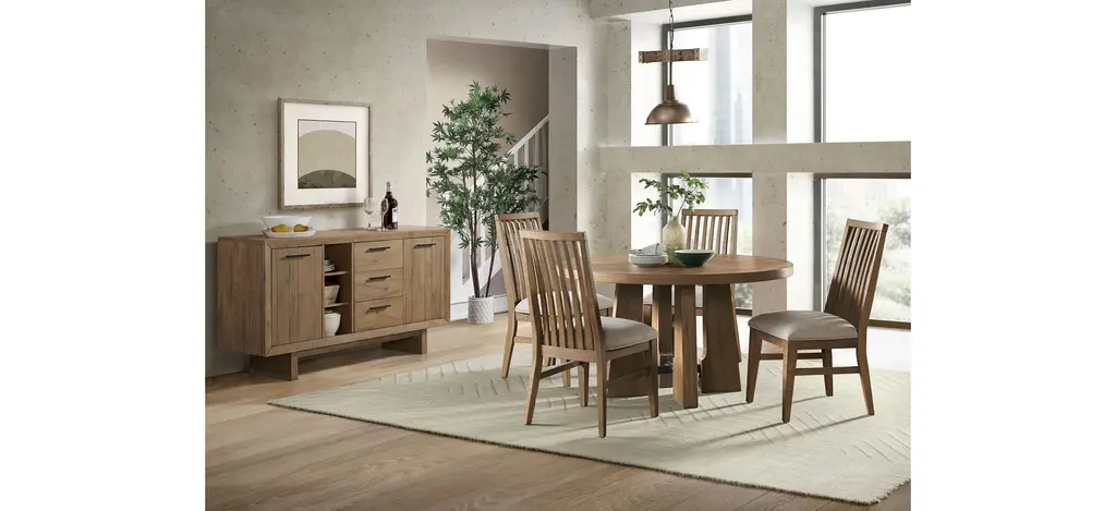 Featuring a unique sunburst pattern, the Landmark Round Table pairs well with the various chairs and bench seating options to best fit into your daily life.