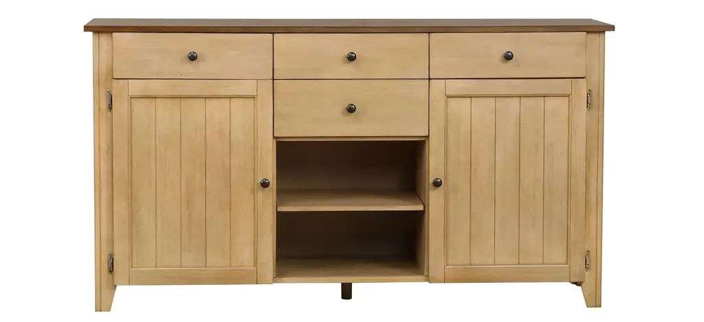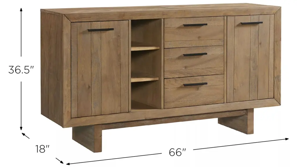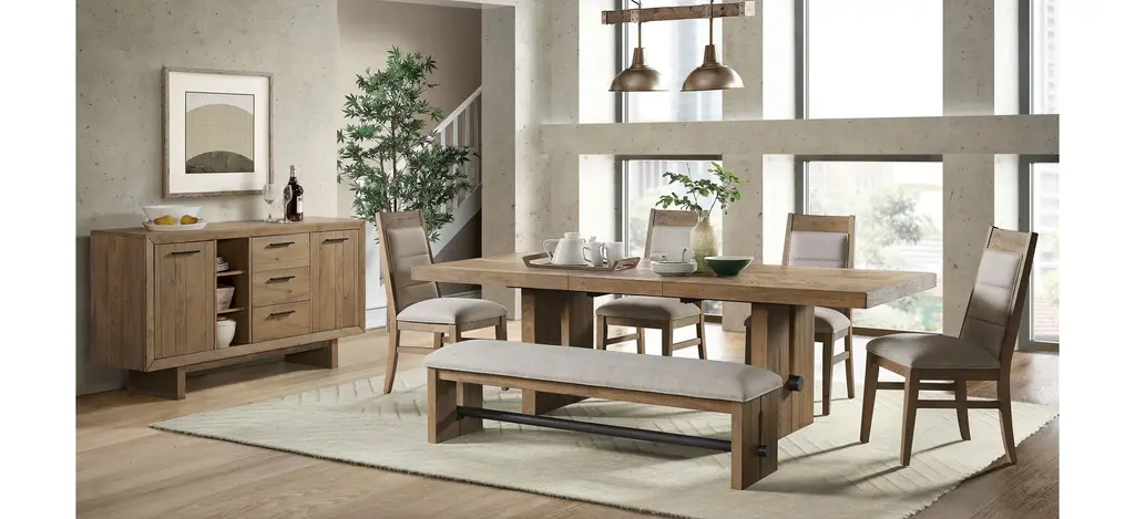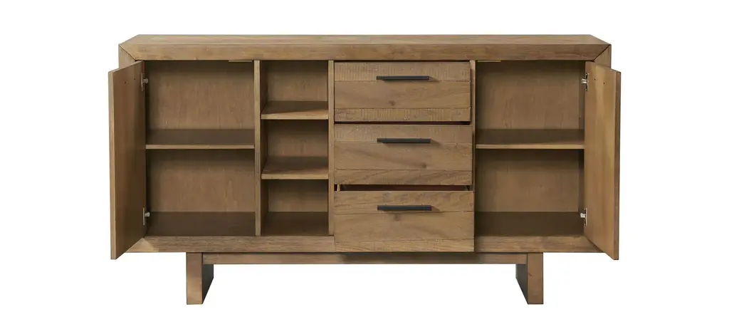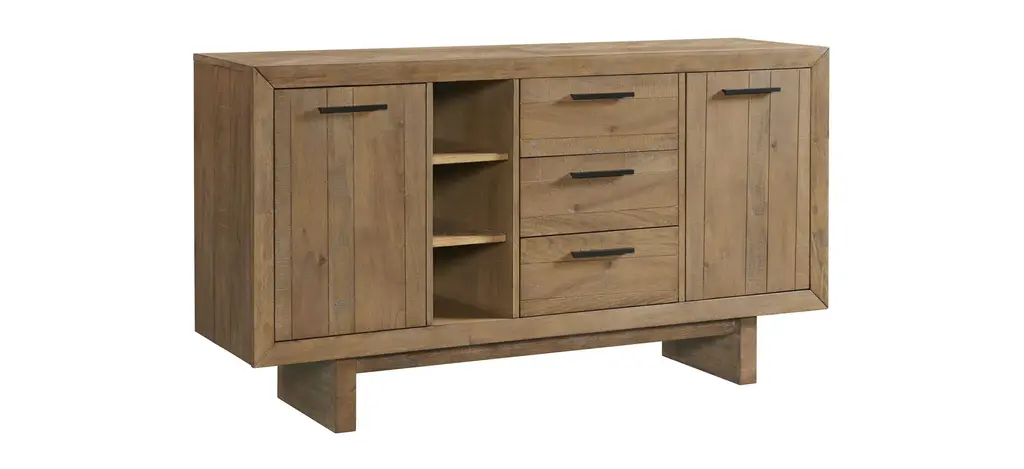 The light saw mark accents and weathered oak finish of the Landmark Sideboard gives this modern collection a rustic feel.