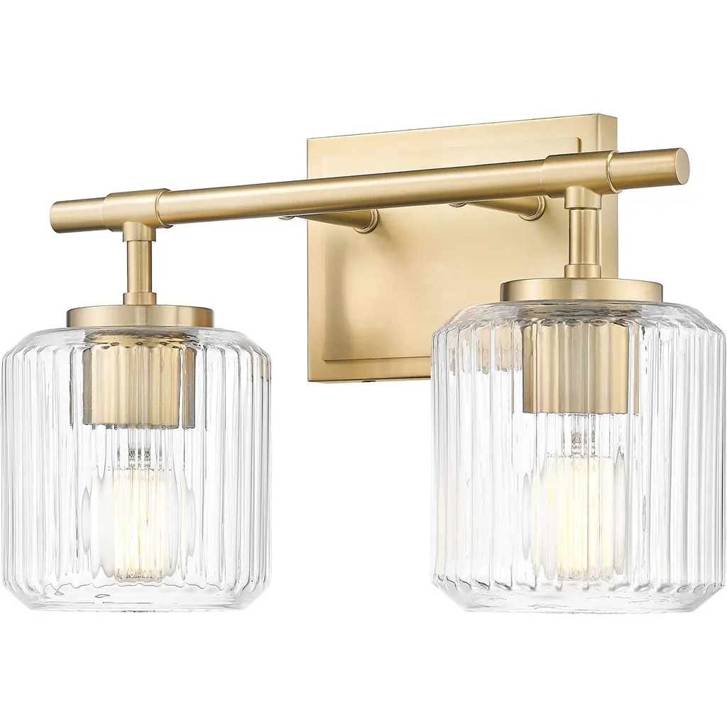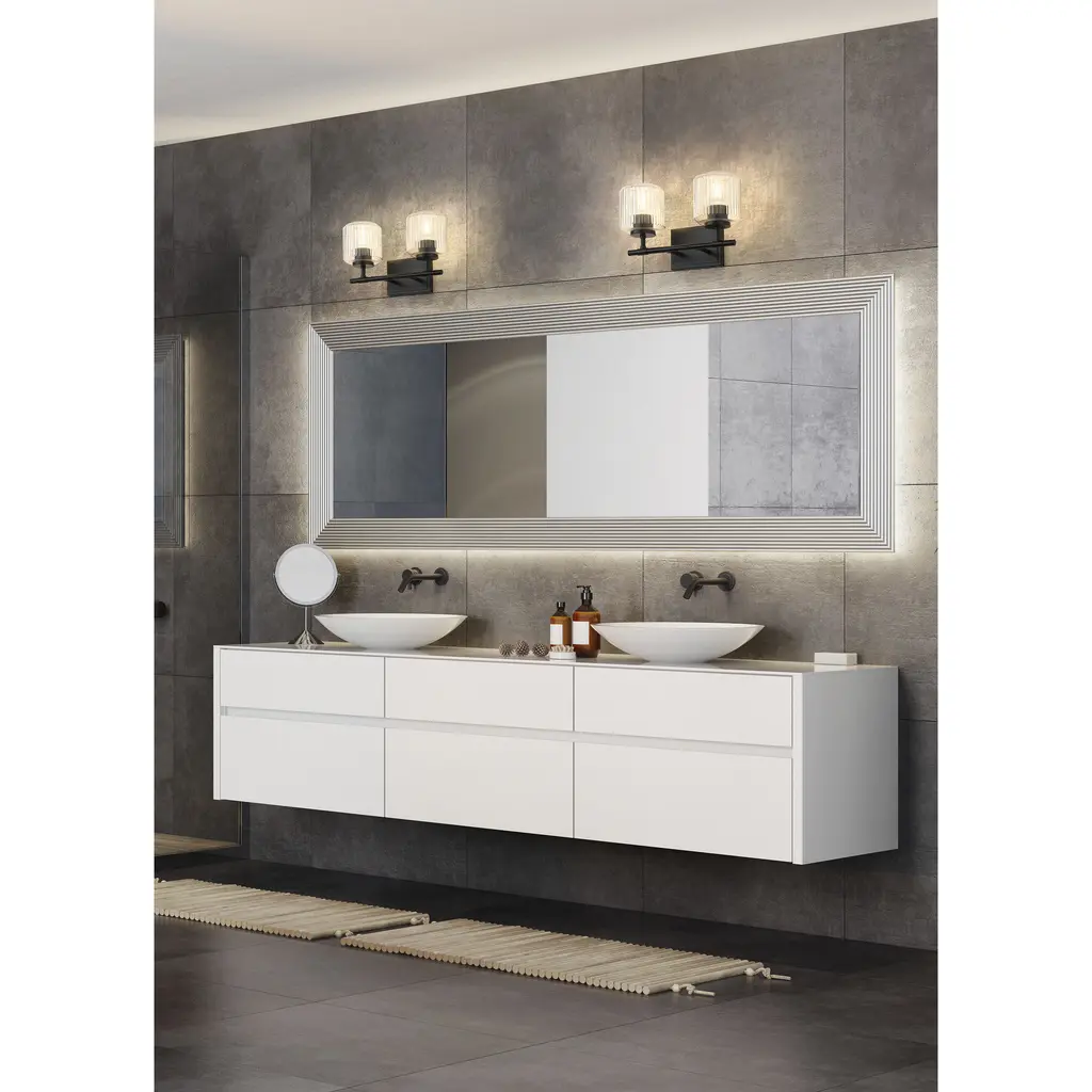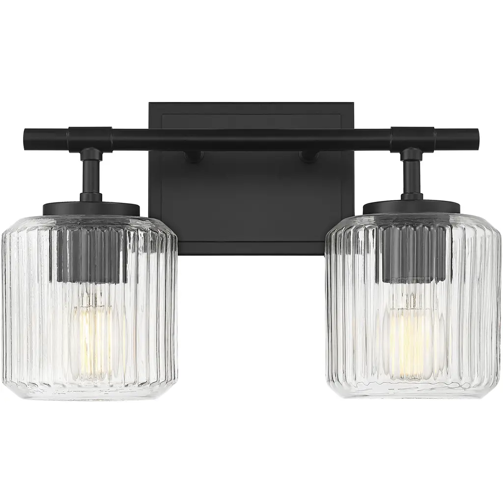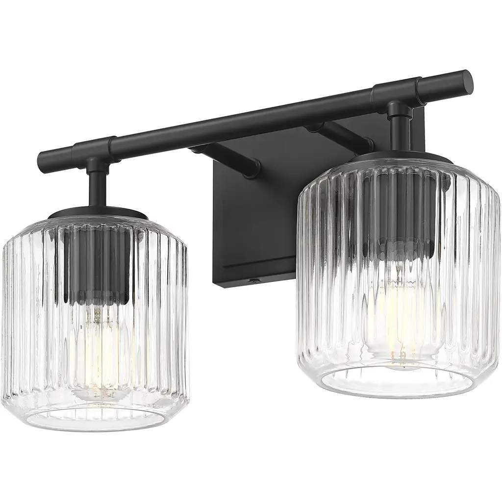 Augment contemporary or traditional design aesthetics with this modern two-light vanity bath light. A rich matte black finish rectangular wall plate and straight arms create contrast and depth, perfect for a variety of bath settings. Ribbed clear glass shades sparkle and seem to undulate when illuminated, adding depth and sophistication.