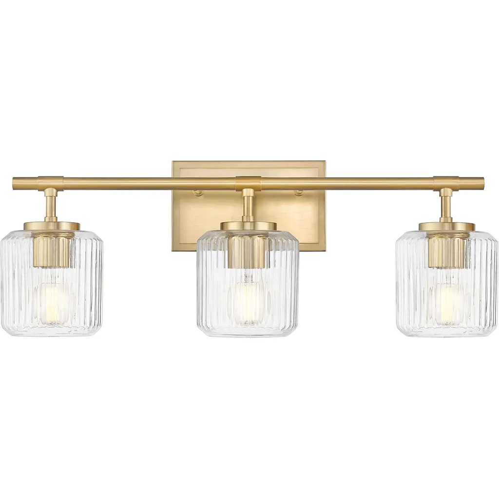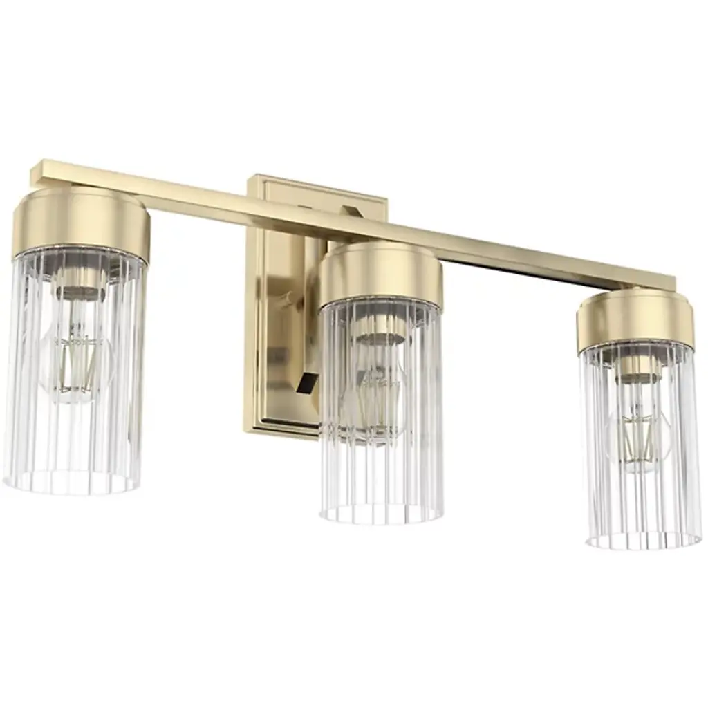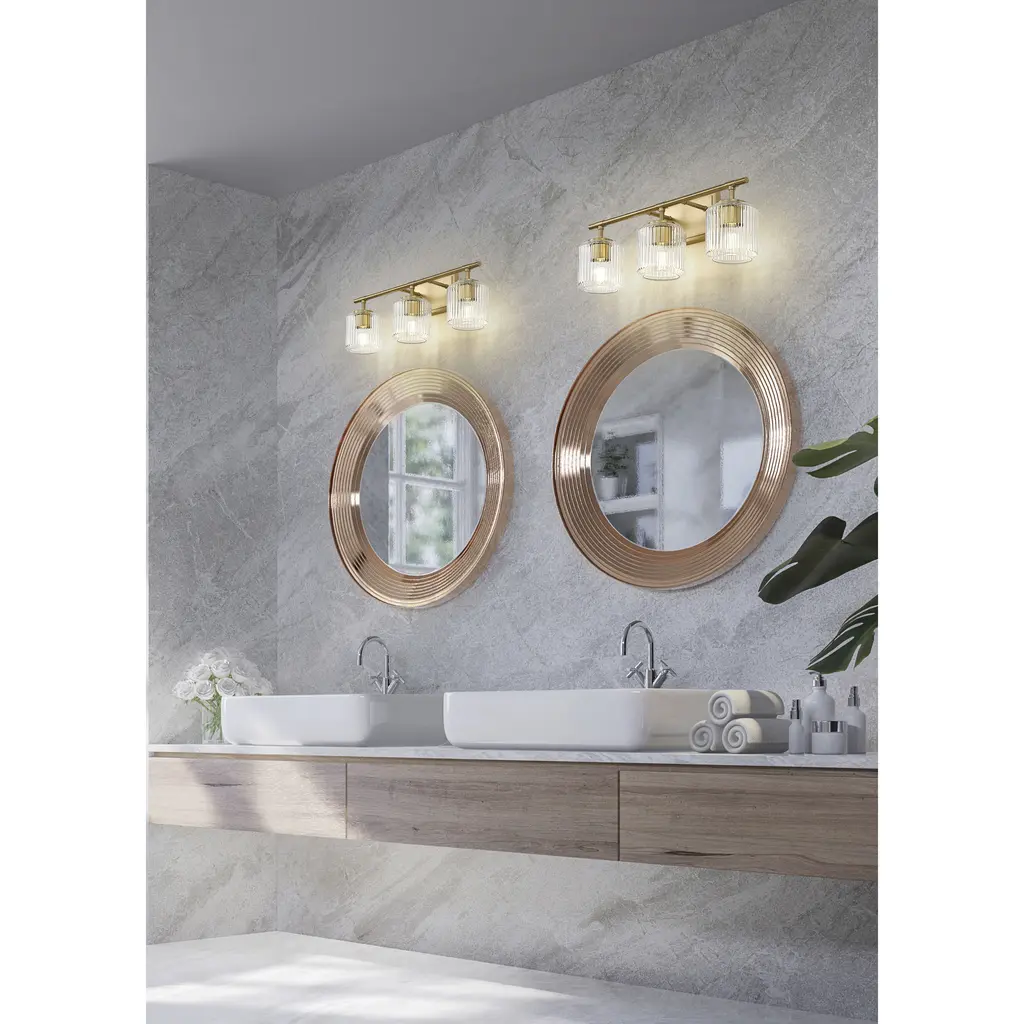 Instill beautiful warmth and sophistication with a contemporary three-light vanity bath light. Its modern gold finish is a superb choice, offering elegance and inviting flair. Ribbed clear glass shades sparkle in the light and create an undulating effect that's simply captivating.