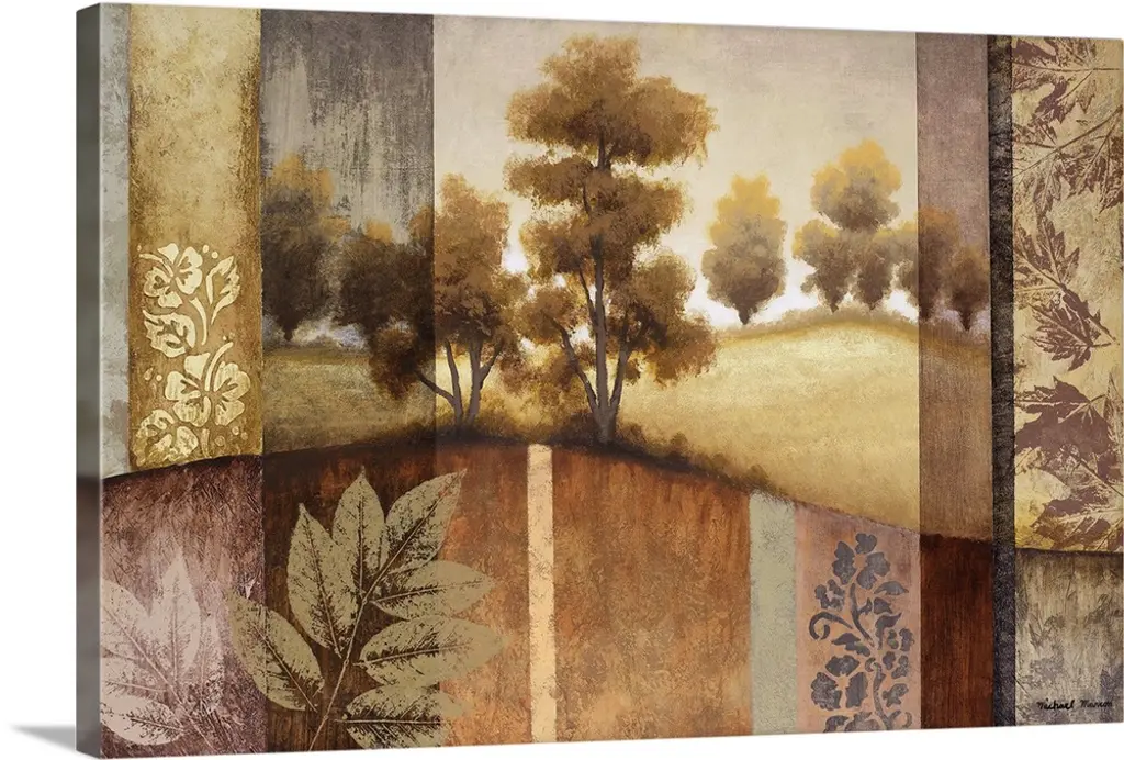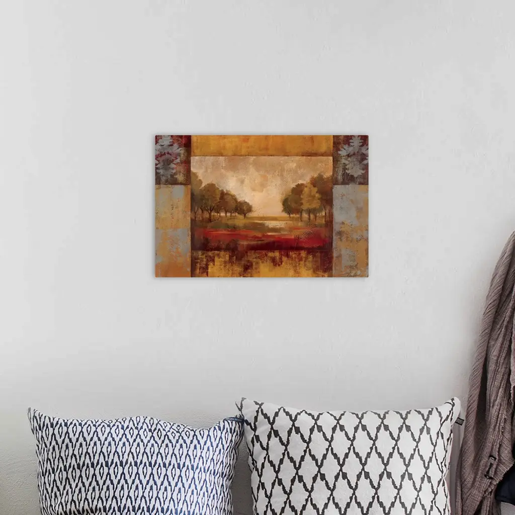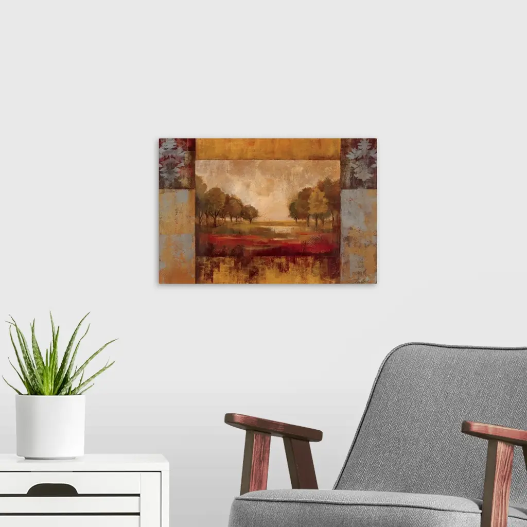 Oversized, horizontal home art docor of a landscape of a clearing with rows of trees on each side, the image surrounded by a thick rectangular border in blocks of varying colors, two of them having a design resembling a leaf in the upper corners. The entire image is painted with rough, sponge textured brushstrokes and heavy on golden tones.