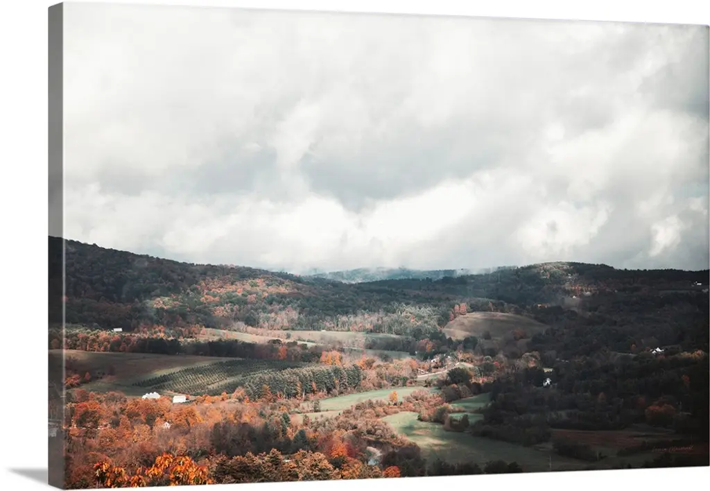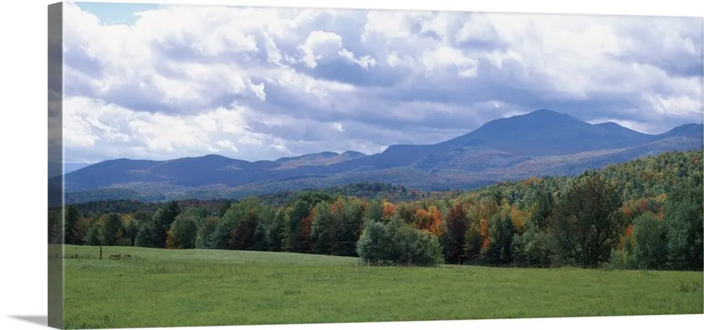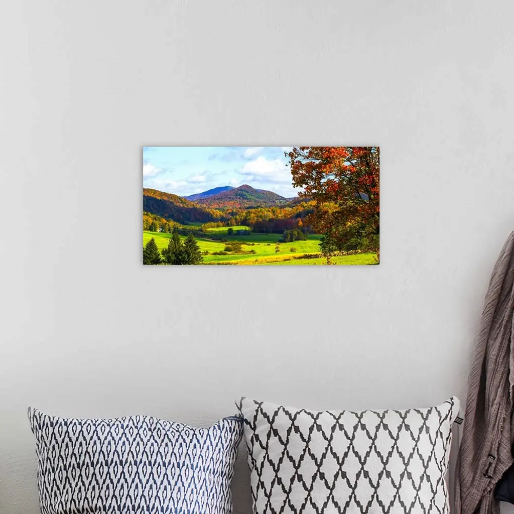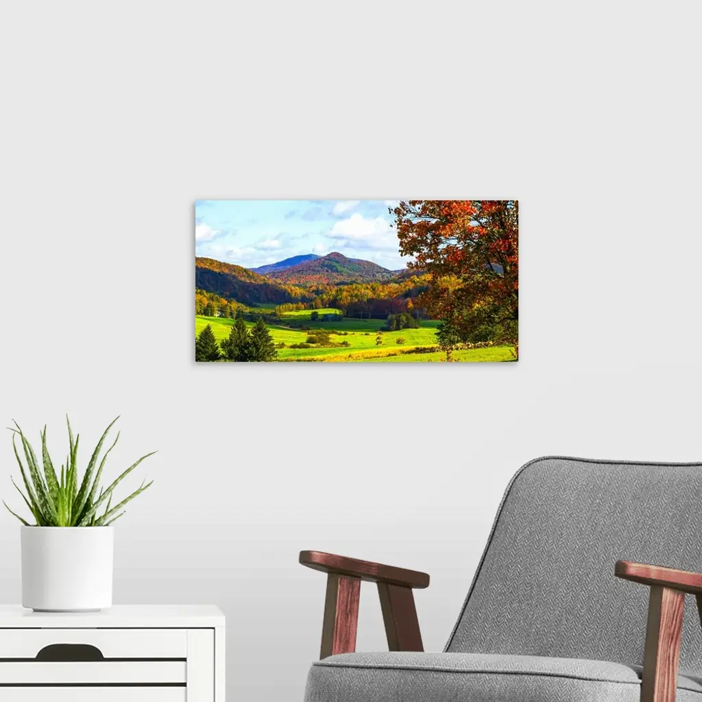 Landscape of forests on the hills with autumn colored foliage and lush green fields in the foreground; Iron Hill, Quebec, Canada