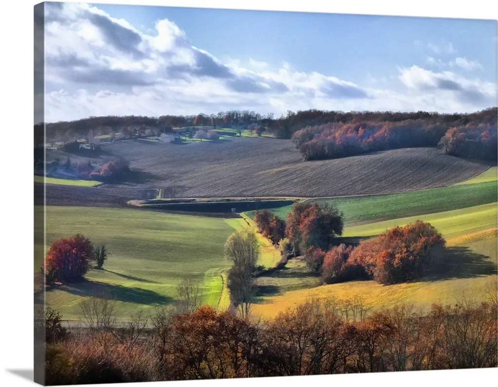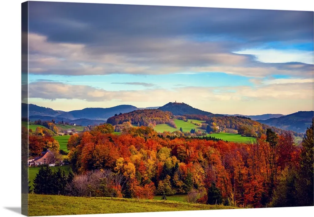 Landscape Of Forests On The Hills With Autumn Colored Foliage And Lush Green Fields