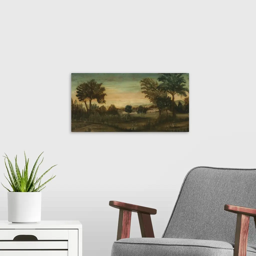 Landscape with Buildings, late 18th century, oil on wood. By American School.