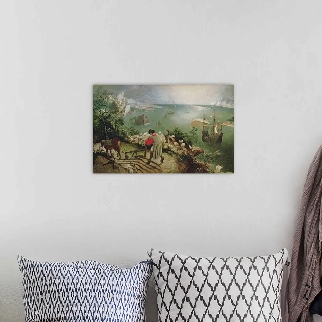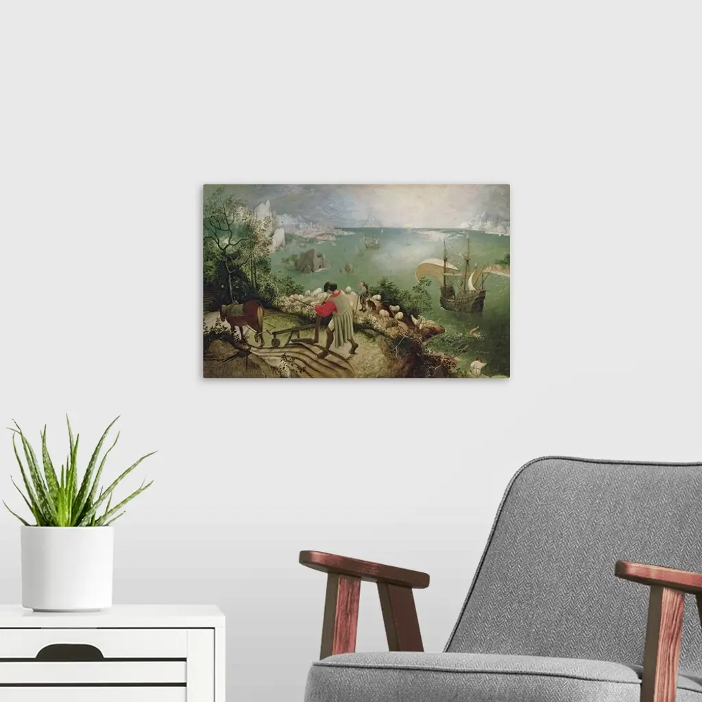 XIR3675 Landscape with the Fall of Icarus, c.1555 (oil on canvas) by Bruegel, Pieter the Elder (c.1525-69); 73.5x112 cm; Musees Royaux des Beaux-Arts de Belgique, Brussels, Belgium; (add. info.: Icarus seen with his legs thrashing in the sea); Giraudon; Flemish, out of copyright