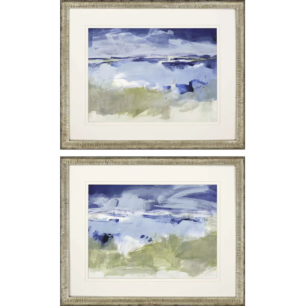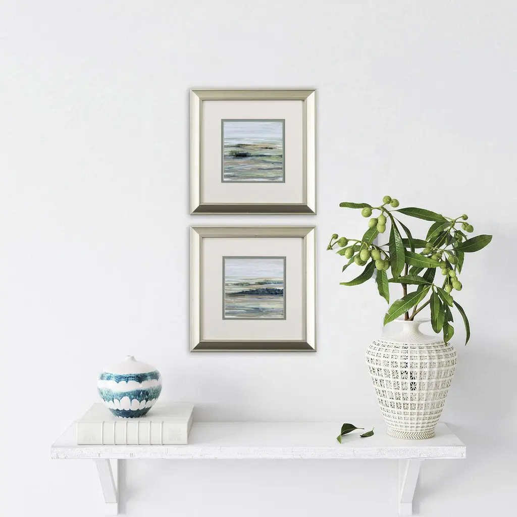 A set of transitional landscape images are double matted in white and sea mist and framed in a champagne gold finish moulding.