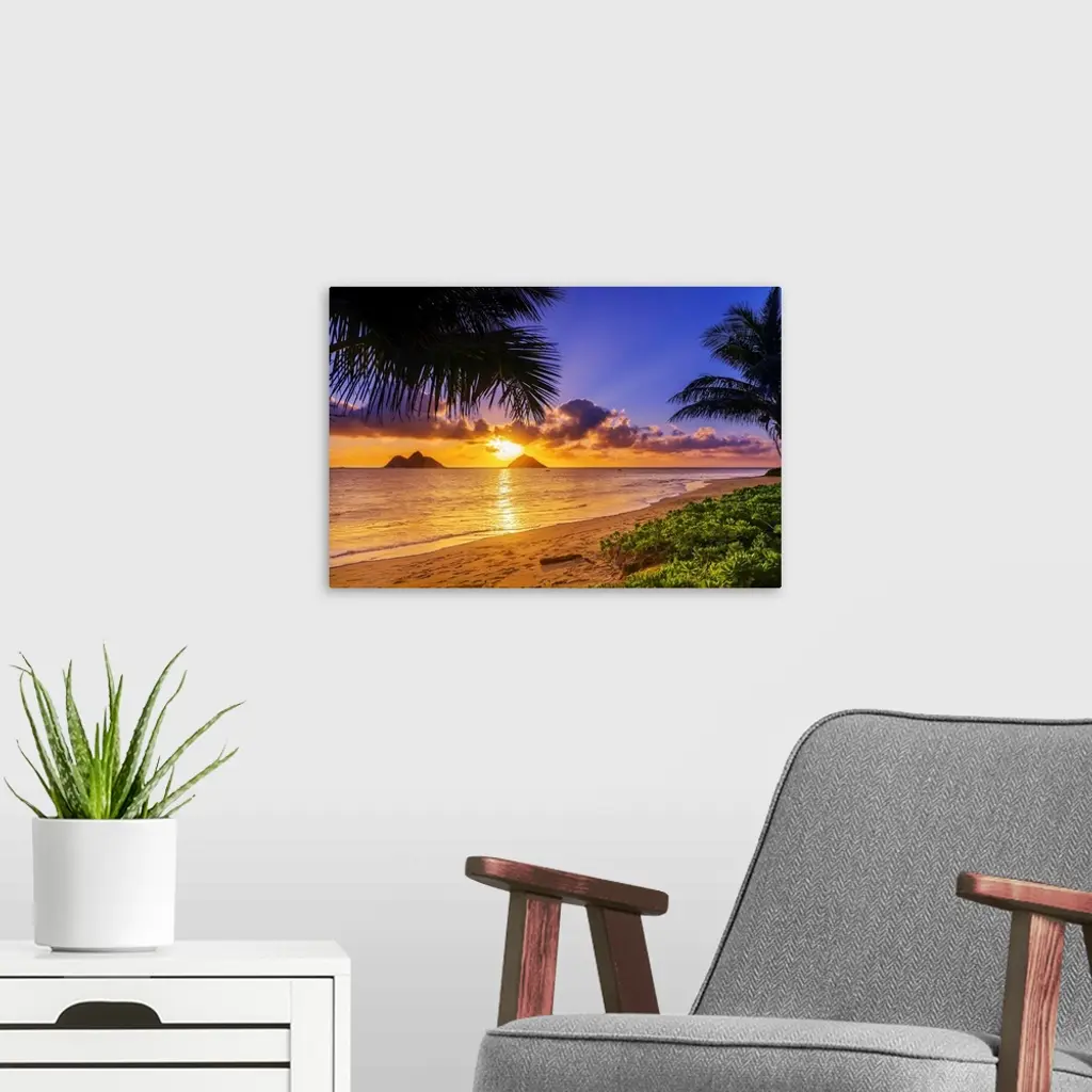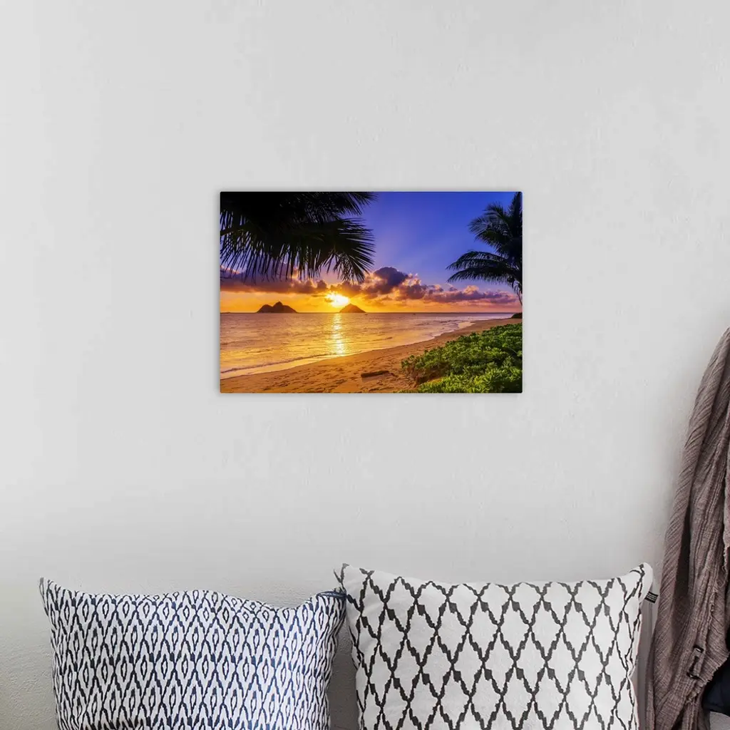 Sunrise viewed from Lanikai Beach with a view of the Mokulua Islands off the coast; Oahu, Hawaii, United States of America.