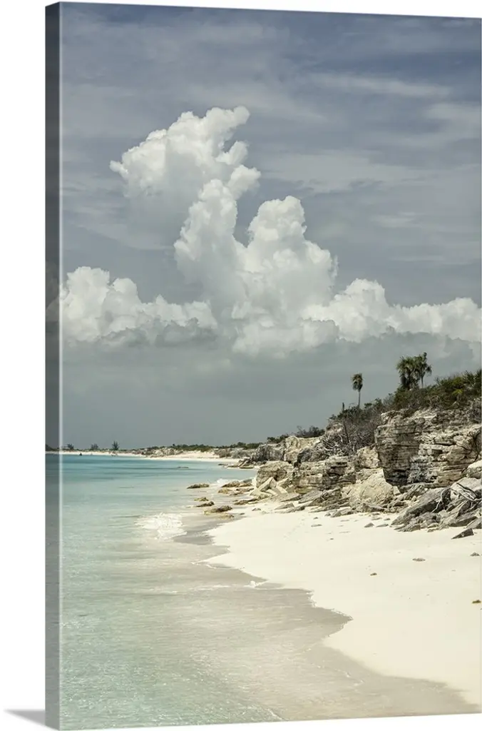 Tropical beach with turquoise water and mountains in the distance.
