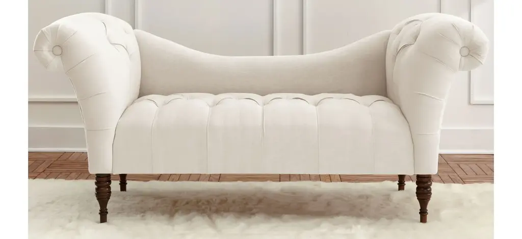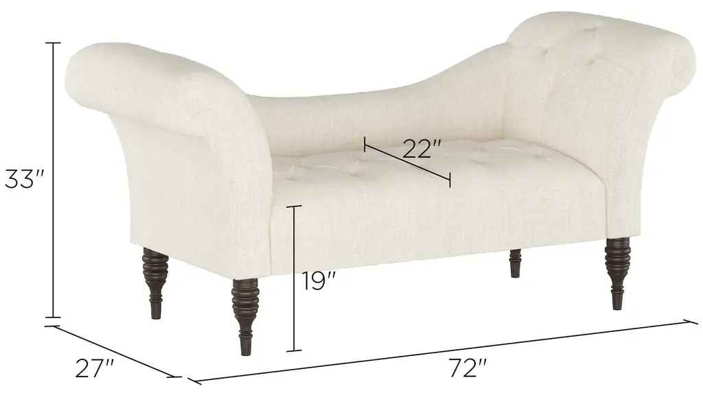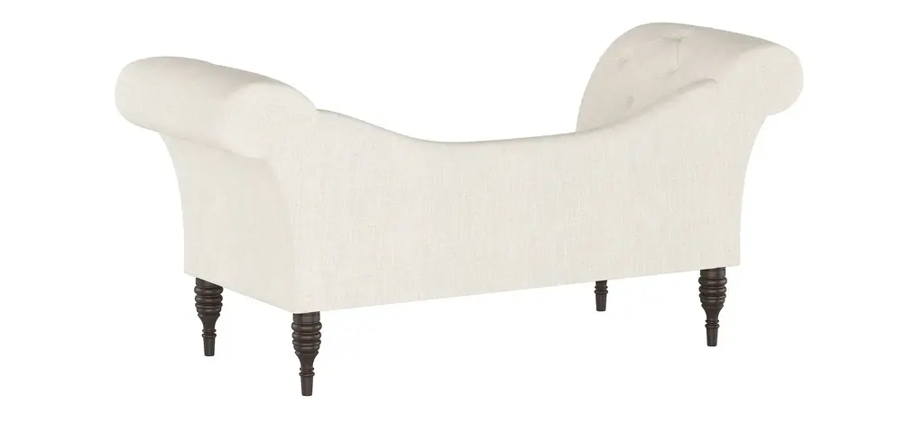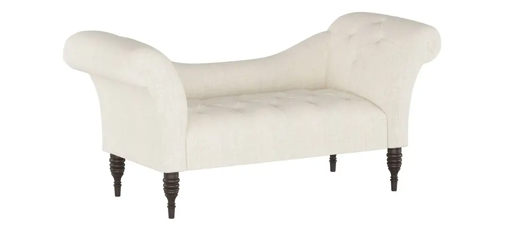 The Lansing chaise lounge prides itself in its old-style elegance, with a gently curved backrest and spectacularly flared roll-arm silhouette. Hand-finished diamond tufting adds plushness and timeless appeal. Upholstered in a fashionable fabric.