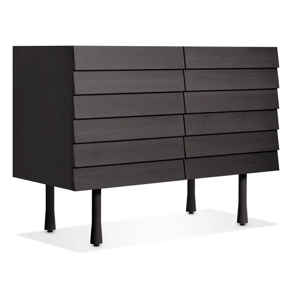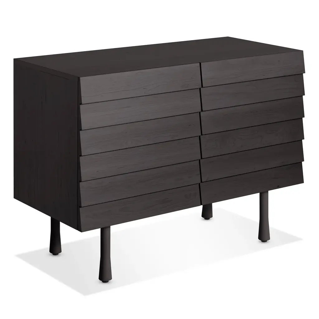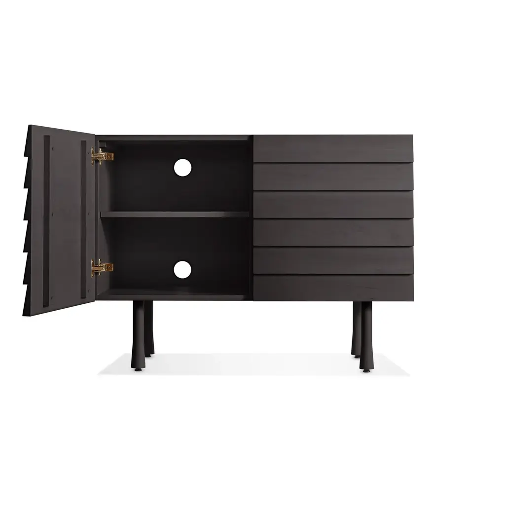 Overlapping wood drawer and door fronts give the collection its name, while elegant wood finishes and a scene-stealing leg bring the visual charisma. With soft-close doors.