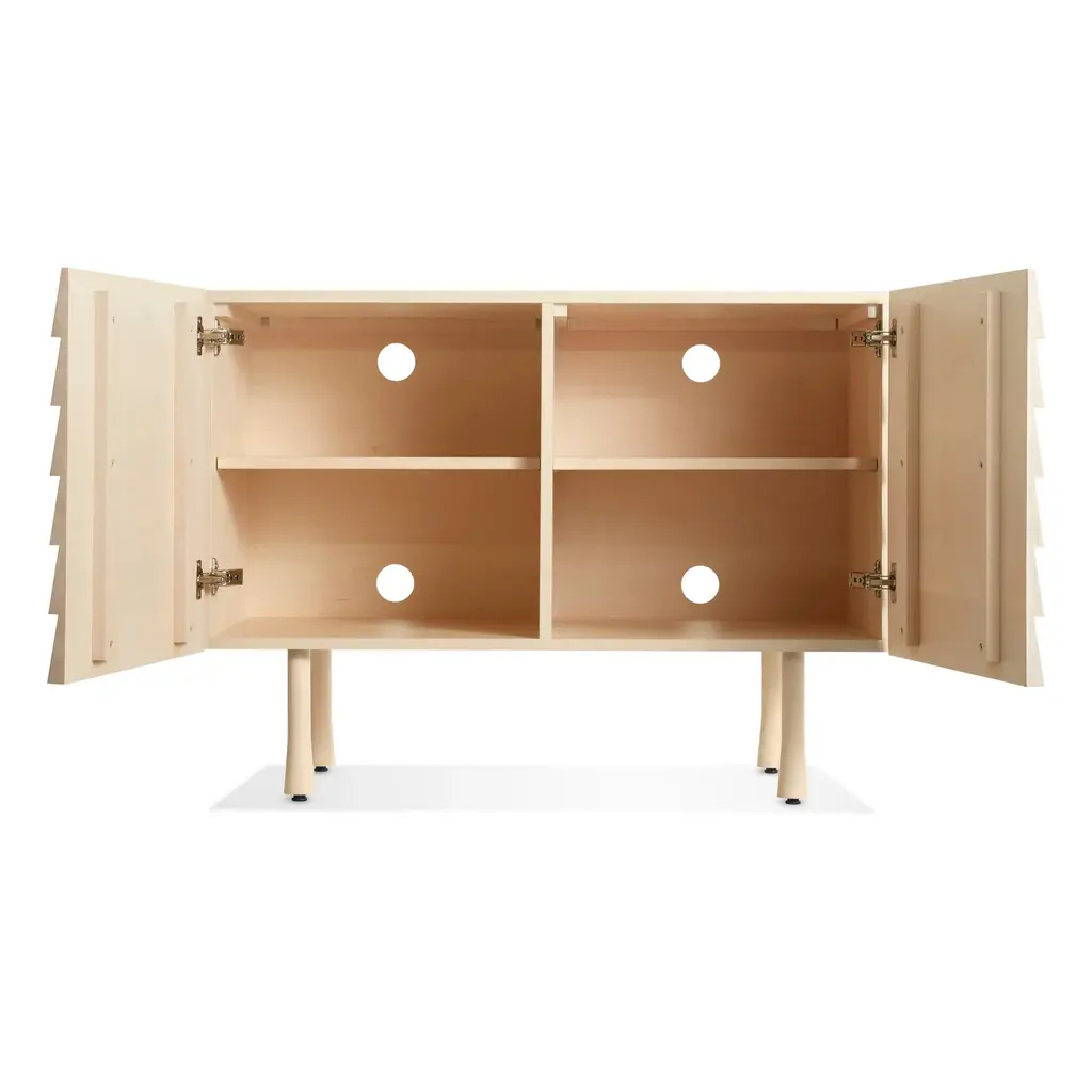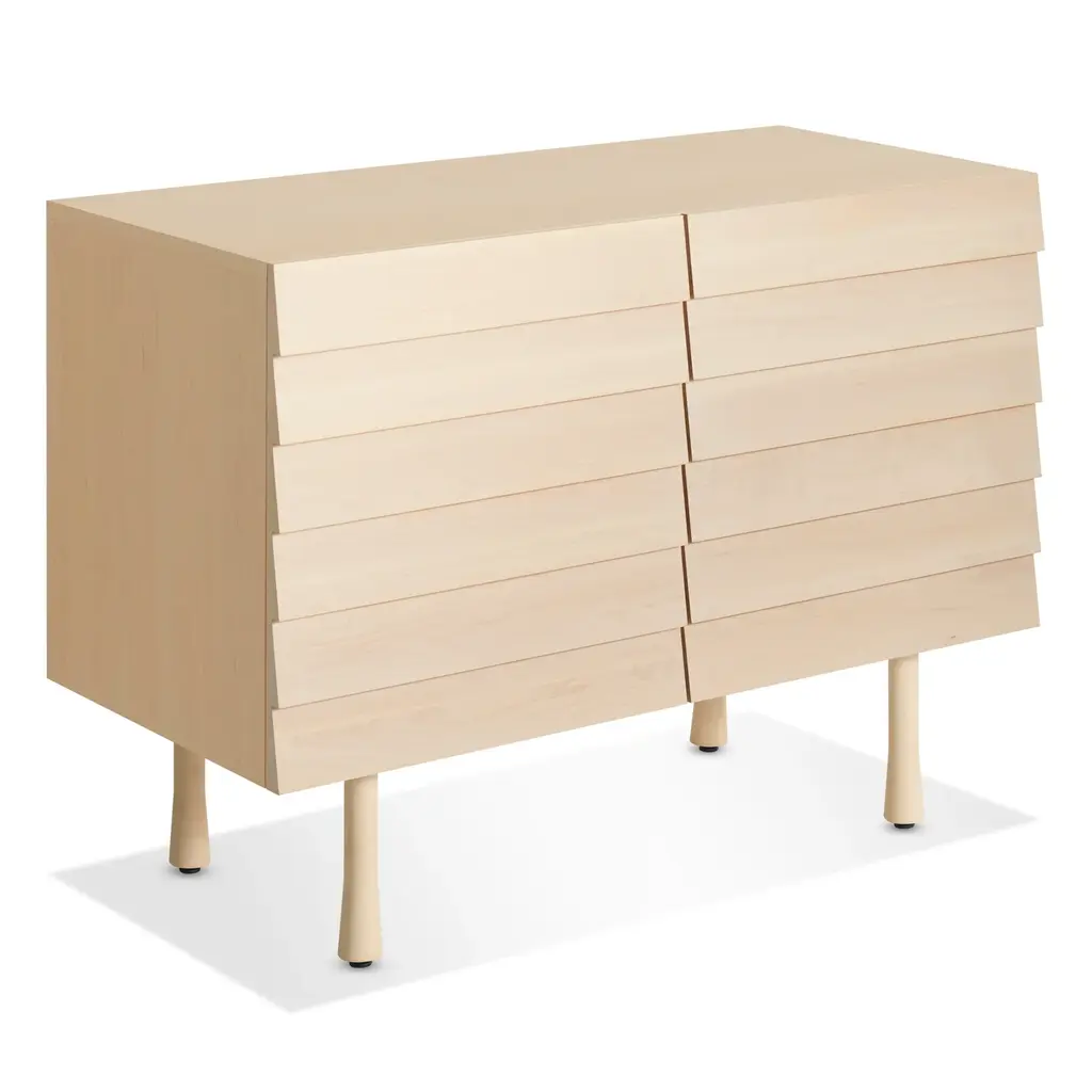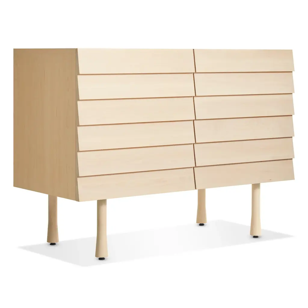 Overlapping wood drawer and door fronts give the collection its name, while elegant wood finishes and a scene-stealing leg bring the visual charisma. With soft-close doors.