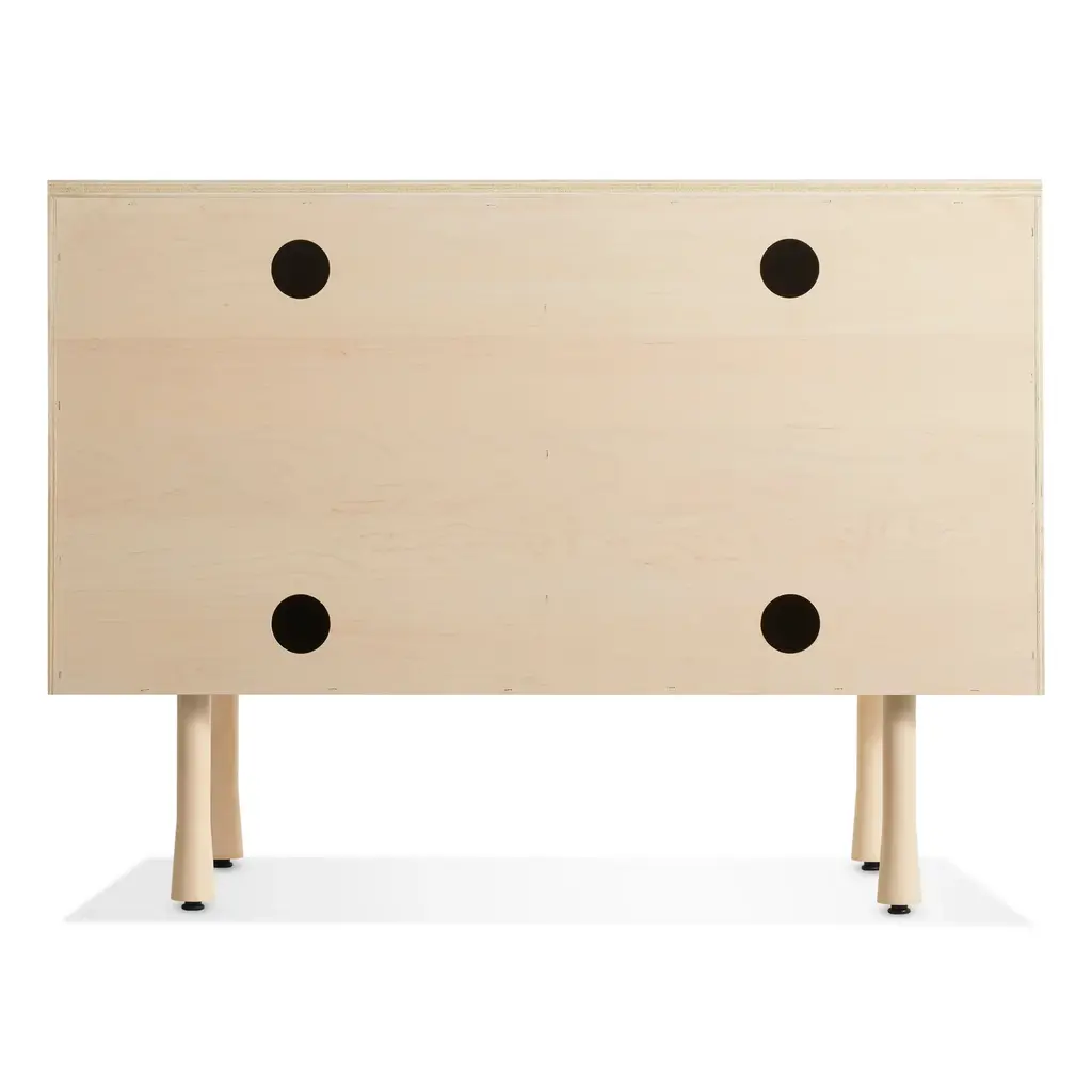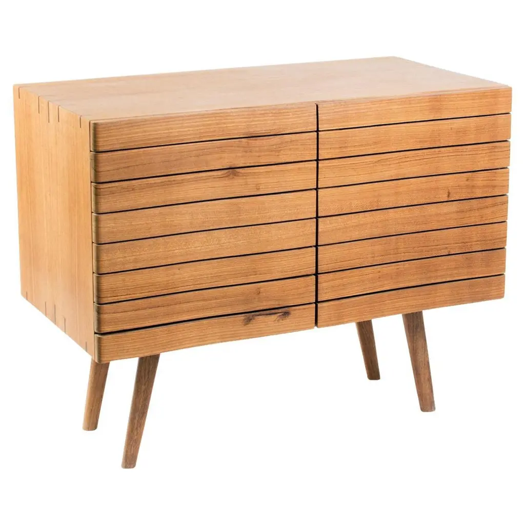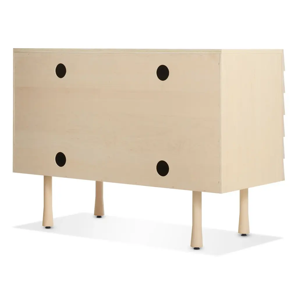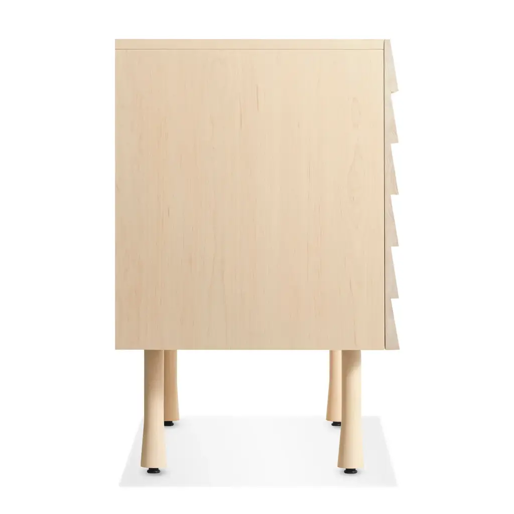Overlapping wood drawer and door fronts give the collection its name, while elegant wood finishes and a scene-stealing leg bring the visual charisma. With soft-close doors.