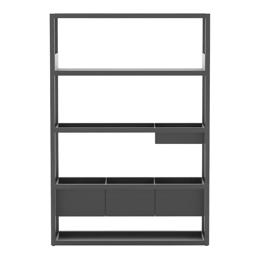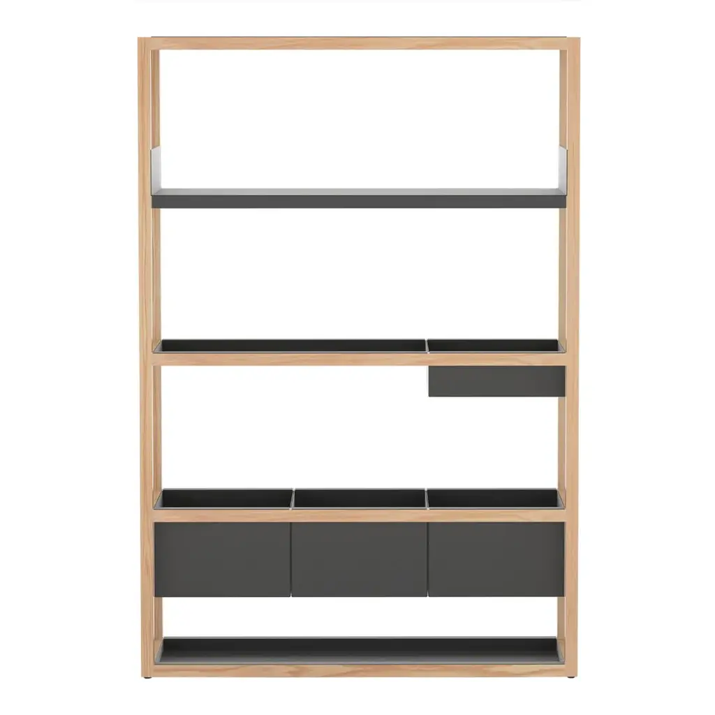 Flexible shelving system, available in three heights with a variety of component configurations. The width can be increased by adding extension units and more metal components. Shelving Components: Medium Frame - [1] Deep Box - [3] Shallow Box - [1] Tray Shelf - [2] Small Tray Shelf - [1] Bookshelf (U-shaped to keep books in place) - [1] Suitable for Contracts use. Assembly required. 1 year warranty for manufacturing defaults.