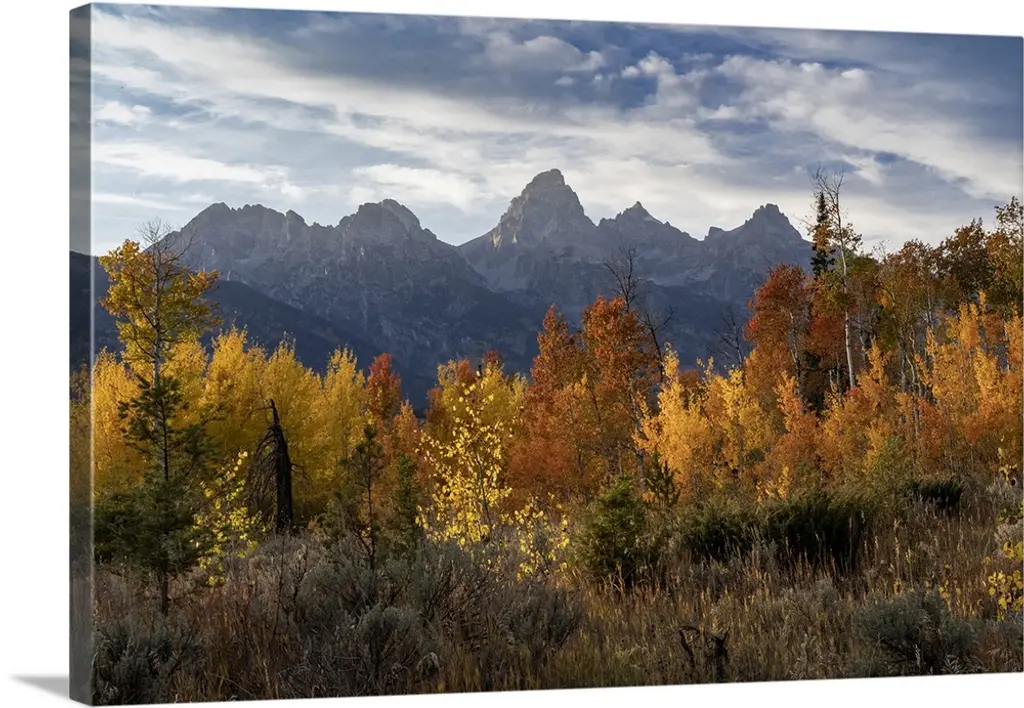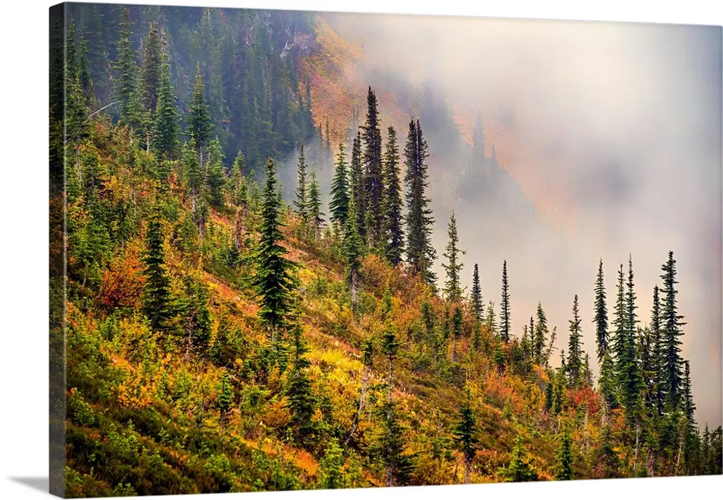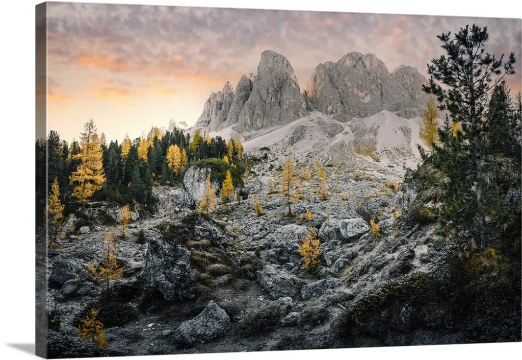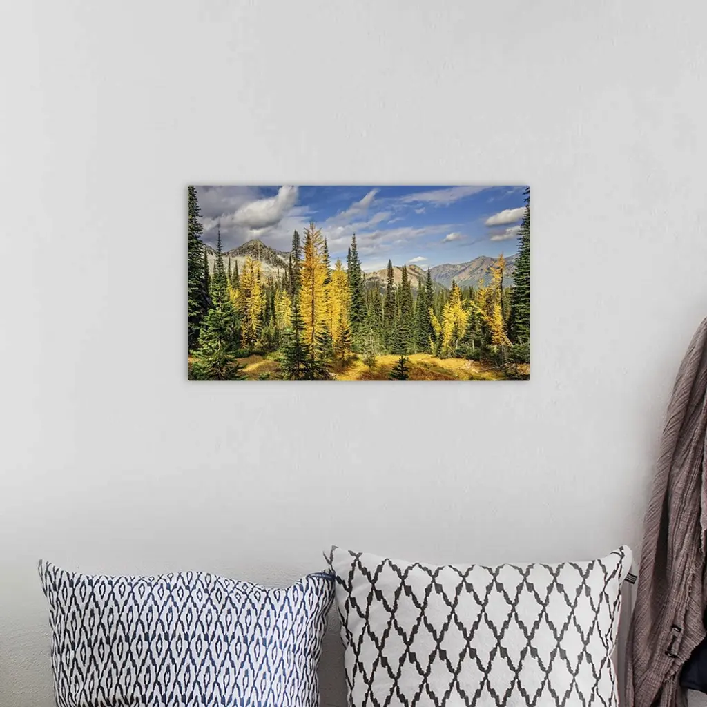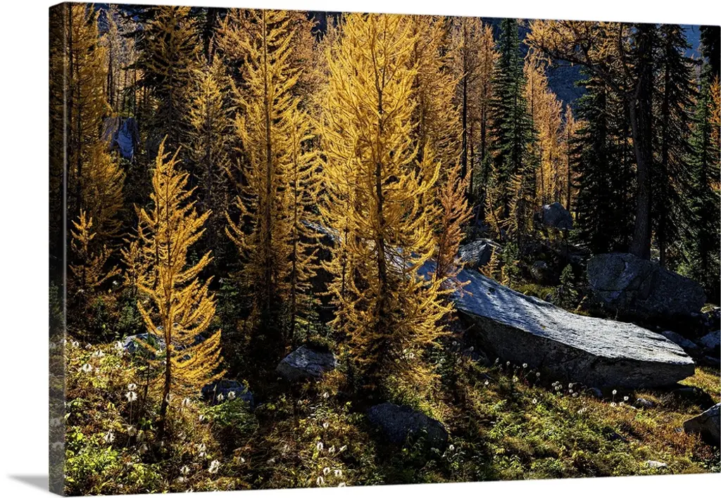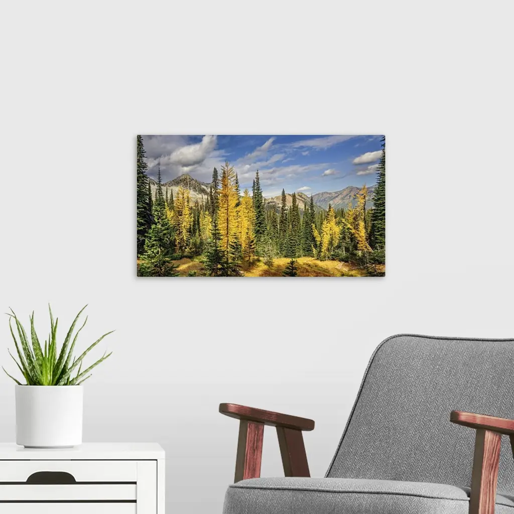 Alpine larches and sub-alpine fir in fall in the mountains.