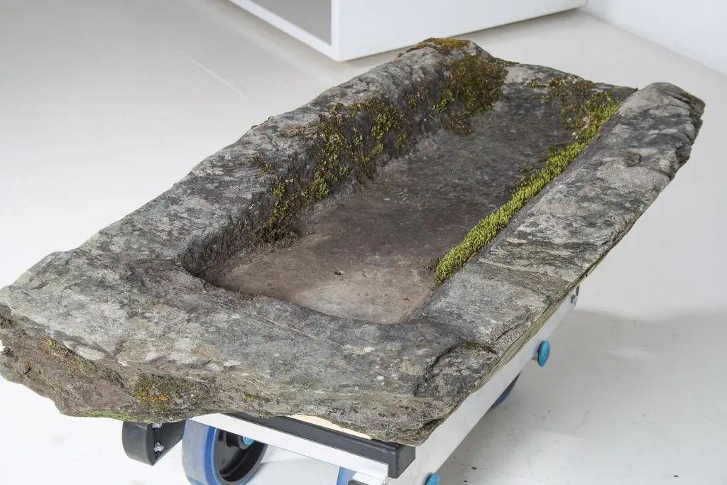 This reclaimed 17th-century sedimentary stone trough from Egryn Hall in Gwynedd, Wales, is a remarkable artefact steeped in history. Crafted from local sedimentary stone, its rugged texture and earthy tones reflect the natural materials of its time. The trough features a gently weathered surface, adorned with subtle variations in colour ranging from deep greys to warm browns and greens, showcasing the stone’s age and the elements it has endured.Measuring approximately 1.1 meters in length, the trough features an irregular rectangular shape that adds to its unique character. The edges are uneven, a reflection of the natural stone’s formation and the primitive handcrafting techniques used during its creation. This asymmetry contributes to the trough’s rustic charm and authenticity. Its original purpose, likely for holding water or grain, is suggested by the shallow bowl-like interior which has developed a rich smoothness over centuries of use. The time-worm patina has a rich layer of lichen and moss.The historical significance of the trough is amplified by its provenance, having been unearthed from the grounds of Egryn Hall, a medieval property that once served as a prominent manor in the region. This connection to Egryn Hall adds a layer of intrigue, hinting at the lives and activities that occurred on the estate.Today, this rare piece not only serves as an historical artifact of the period but also as a timeless decorative element, ideal for use in gardens or as a striking internal focal point in rustic or contemporary settings. Its reclaimed status enhances its appeal, making it a sustainable choice for those looking to incorporate history into their spaces.Note that 2x small drainage holes are later additions, these can be retained for use as a planter or could be plugged for use as a birdbath.At time of listing, we have two of these available and will be sold individually. Note that the wood block shown under the stone is not included.An unique opportunity to own a rare and special piece of important architectural history. In the photo of Ergyn Hall from the late 1990s, the stone troughs can be seen in the undergrowth on the right-hand side, midway down the photo. More photos and history of Egryn Hall can be found on the ‘Coflein’ website referenced in the photo and on the National Trust website.About Egryn HallEgryn Hall, located in Gwynedd, Wales, is a historically significant property that is now managed by the National Trust. A remarkably complete surviving late medieval hall house, retaining virtually all of its original internal carpentry, the quality of detail richly demonstrating its high status. The house also displays an interesting development sequence with good 16th to 17th Century detail associated with its adaptation to storeyed form, and a Victorian wing marking a later concession to changing architectural tastes and spatial requirements.This impressive structure dates back to the medieval period (dendrochronology has given felling dates of 1507-10 for the hall and 1592-1622 for the insertion of the upper floor). Egryn Hall is characterized by its distinctive features, including intricate stonework and large, period windows that provide glimpses into its storied past. The property has been a focal point of local history, serving various functions over the centuries, including as a residence and a gathering place for the gentry. The hall is surrounded by picturesque grounds and set in local farmland which add to its charm and offer visitors a scenic experience.As a National Trust property, Egryn Hall is preserved for public enjoyment and education. The Trust works to maintain its historical integrity while providing opportunities for visitors to stay at the property to explore the estate and learn about its significance in Welsh history. Informative displays highlight the architectural features and the stories of the families who lived there.The property serves as a testament to the rich cultural heritage of Wales, making it a valuable destination for history enthusiasts and nature lovers alike.