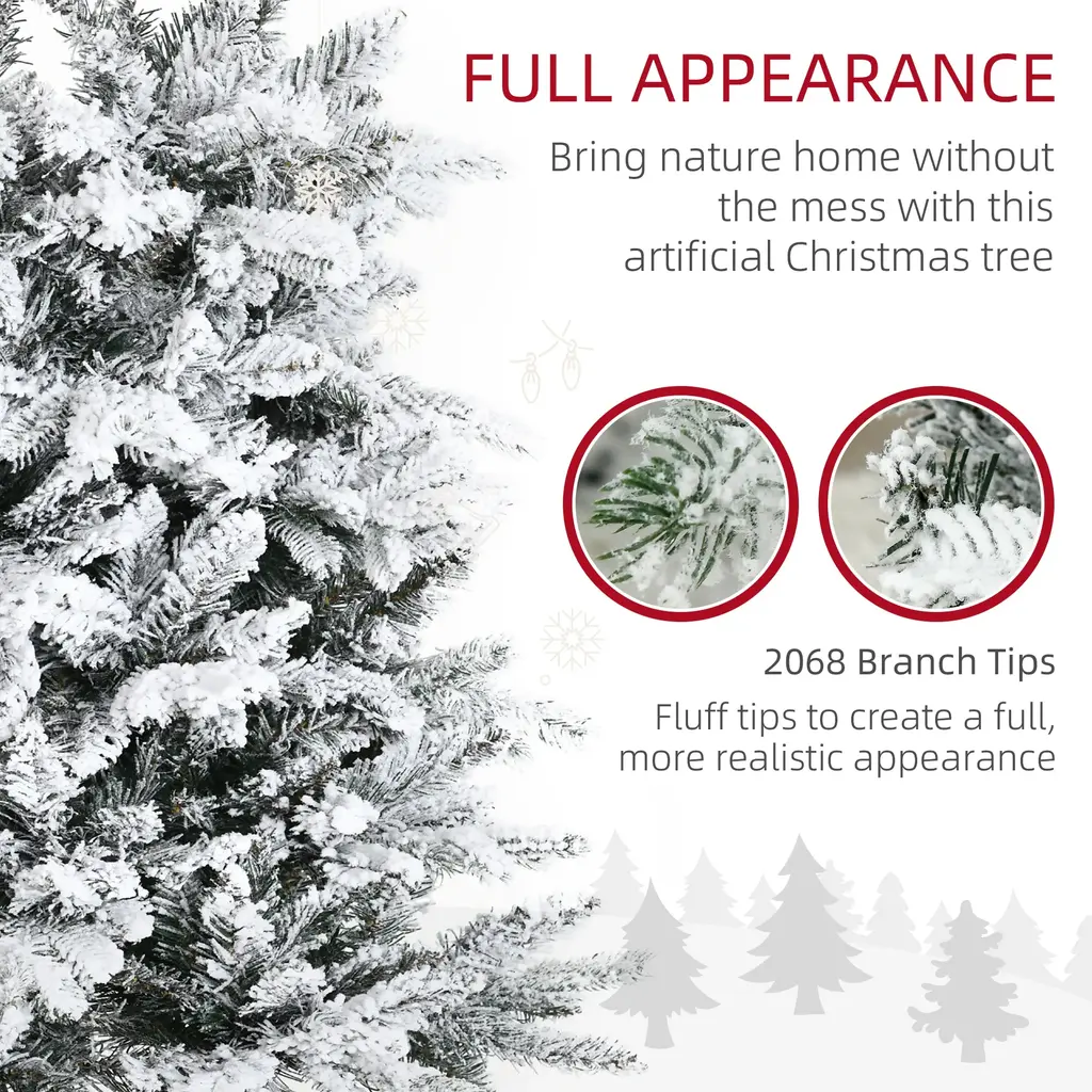 Product Overview Enhance your holiday ambiance with this 9-foot Snow Flocked Artificial Christmas Tree. Designed with 2068 realistic branches, this tree captures the beauty of a snowy winter landscape without the mess of a real tree. Perfect for any indoor space, it offers a festive look with minimal effort.Product Features Specifications Suitable Scenarios This tree is perfect for festive home decorations, enhancing the holiday spirit in any indoor setting.Note For optimal fullness, please spend 45-60 minutes fluffing each branch tip. Ornaments are not included.