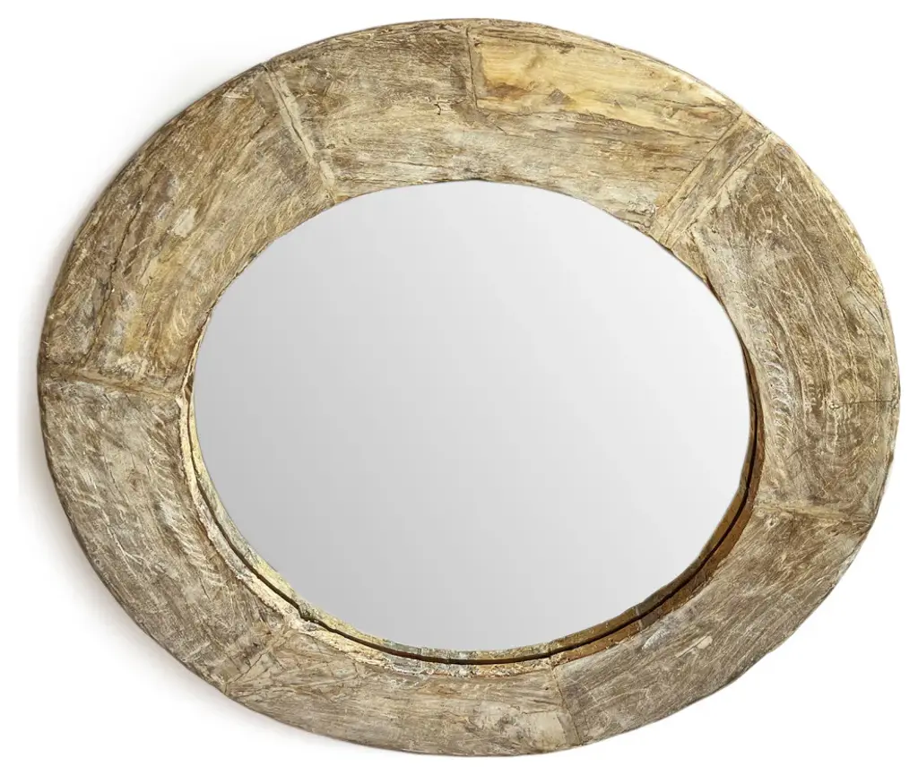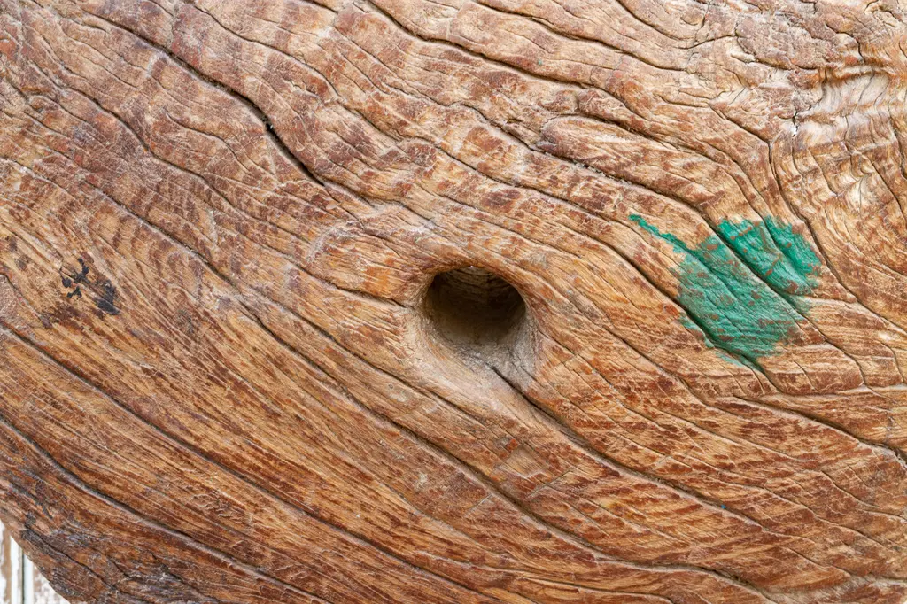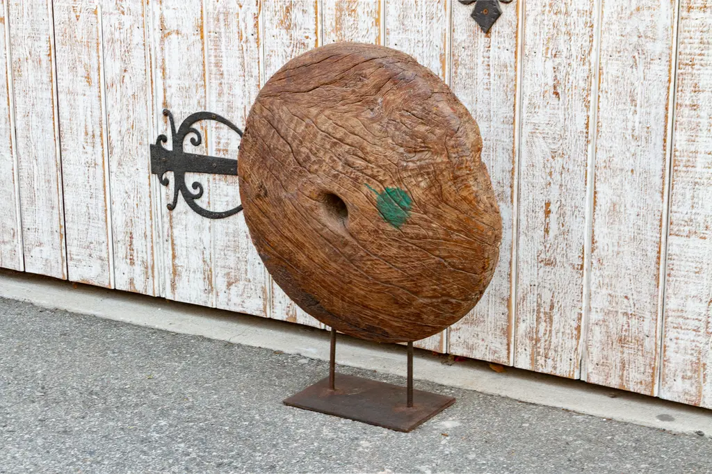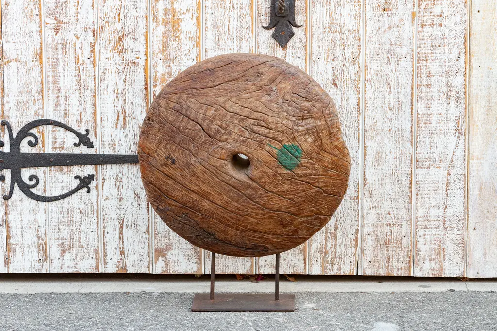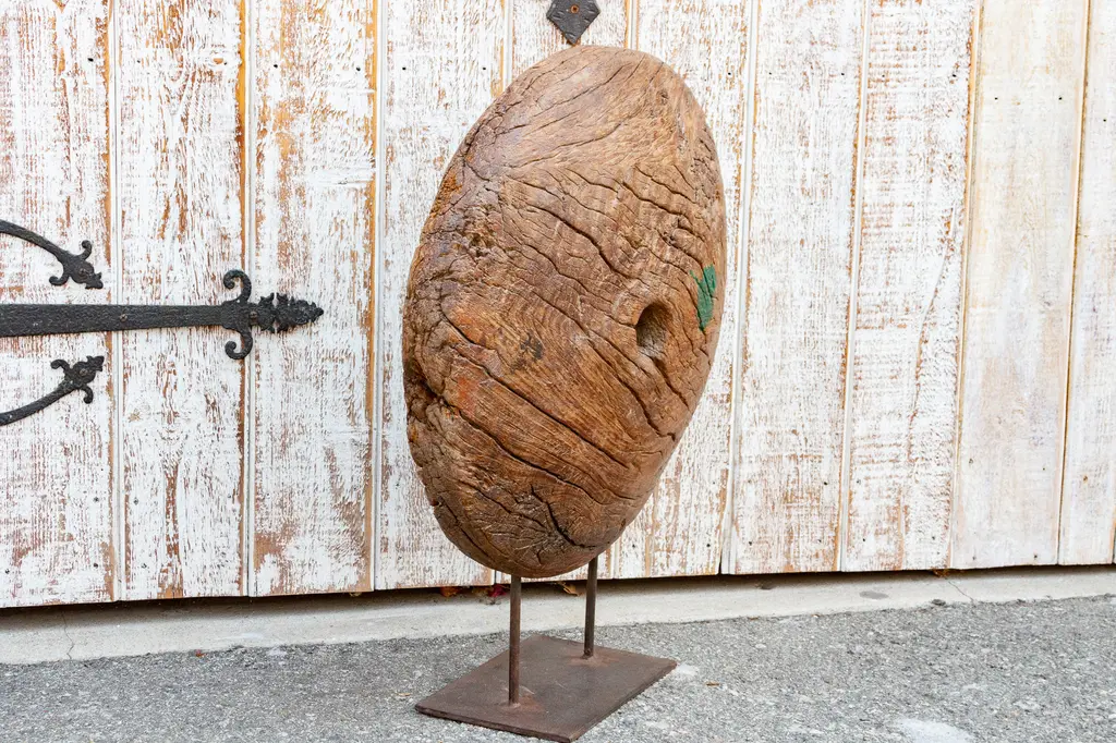 This striking antique wooden ox-cart wheel from India. This wheel has been mounted on a custom metal stand as an artifact. This piece was once used in rural regions in India for farming purposes. This chunky large hand-carved wooden wheel shows natural age, cracks and aged wooden texture. A charming artifact that would make for beautiful decorative piece for any home.