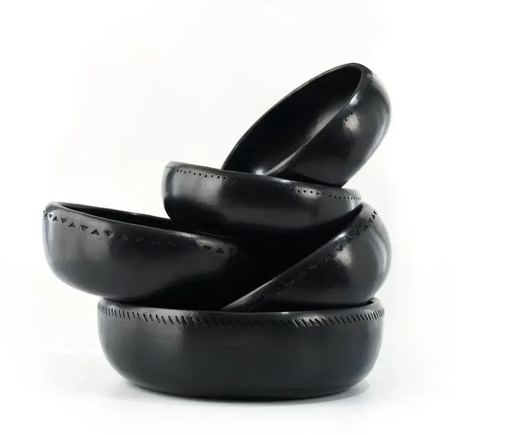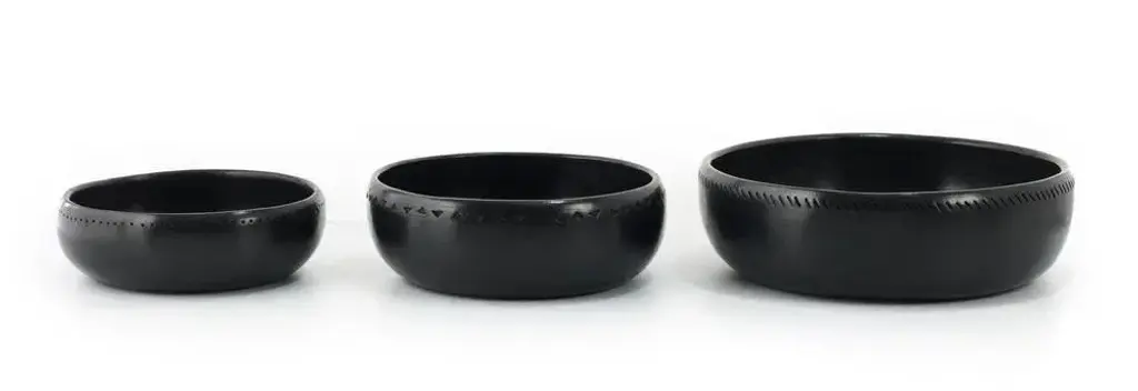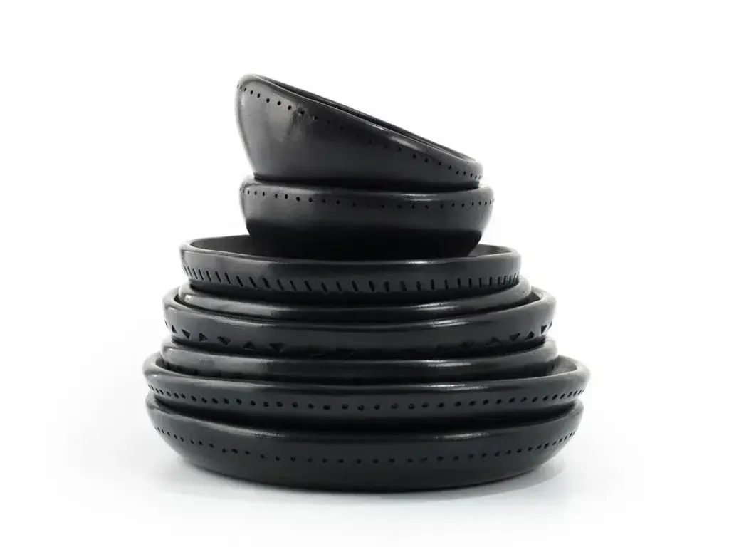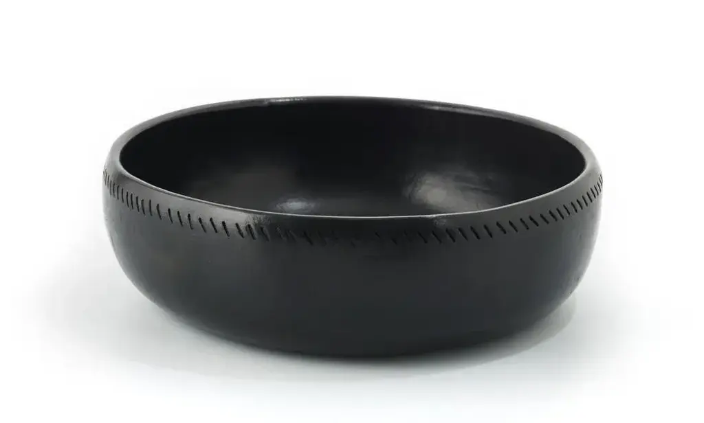 Large bowl barro dining by Sebastian Herkner Materials: Heat-resistant black ceramic. Technique: Glazed. Oven cooked and polished with semi-precious stones. Dimensions: Diameter 38 cm x height 12 cm Available in sizes: Medium, small, and X small. This vase belongs to the Barro dining range, a collection of unique and high-quality ceramics made using traditional pottery crafts. It’s designed by Sebastian Herkner who has taken inspiration from the archetypal forms of jewelry shown in the Museo del Oro in Bogotá. The result is a rustic-elegant range of vases, bowls, and pots that can also be used as plant containers. Ames collaborates for the production of these ceramics with two family-owned businesses based in Tolima, a province that’s been a center for pottery making and ceramic production for more than 300 years. Their workshops employ more than 70 people, many of them are family members, with specialists for each production stage – from clay digging to kiln firing to polishing. One of the few tools the makers use - most of the work is done by hand - is corn husks. Once water and clay have been mixed, the mixture is simply left to dry in the sun. This natural process requires stable weather conditions and air temperatures of more than 35 degrees Celsius.