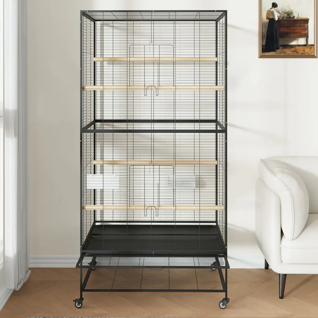 Iron Large Bird Cage with Rolling Stand for Parrots Conures Lovebird Cockatiel Parakeets Give your birds the good life by providing them with a healthy, safe, and fun living environment. large birdcage is the luxury villa of bird homes. Made with low-carbon steel, it’s healthy, safe, and resists wear and tear, corrosion, and rusting. And with four caster wheels, you’ll be able to move the birdcage wherever you need freely. The cage includes an anti-escape design as well, so you’ll never worry about losing your birds.