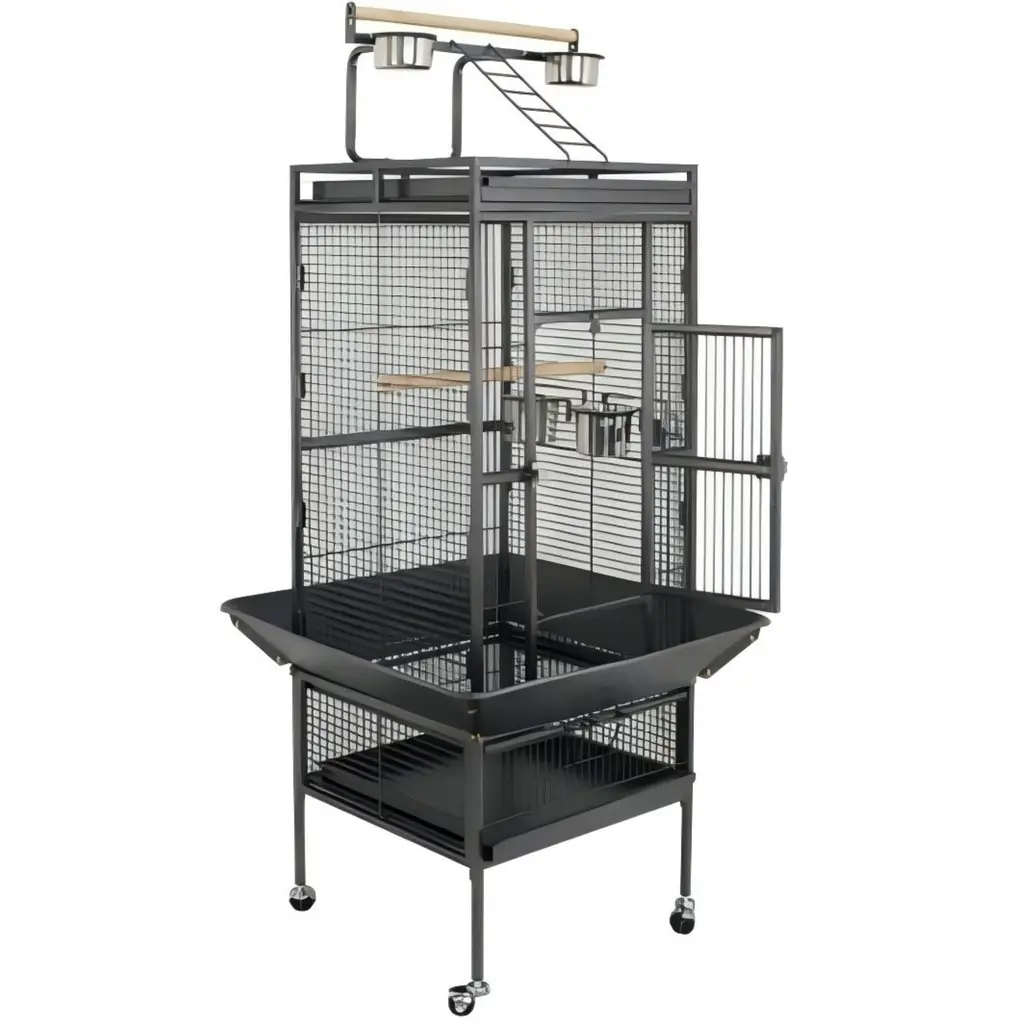 Large Bird Cage With Rooftop Playground & 360° Casters - Rolling Solid Wrought Iron Bird Cage With Roof Top For Parrots - Gray