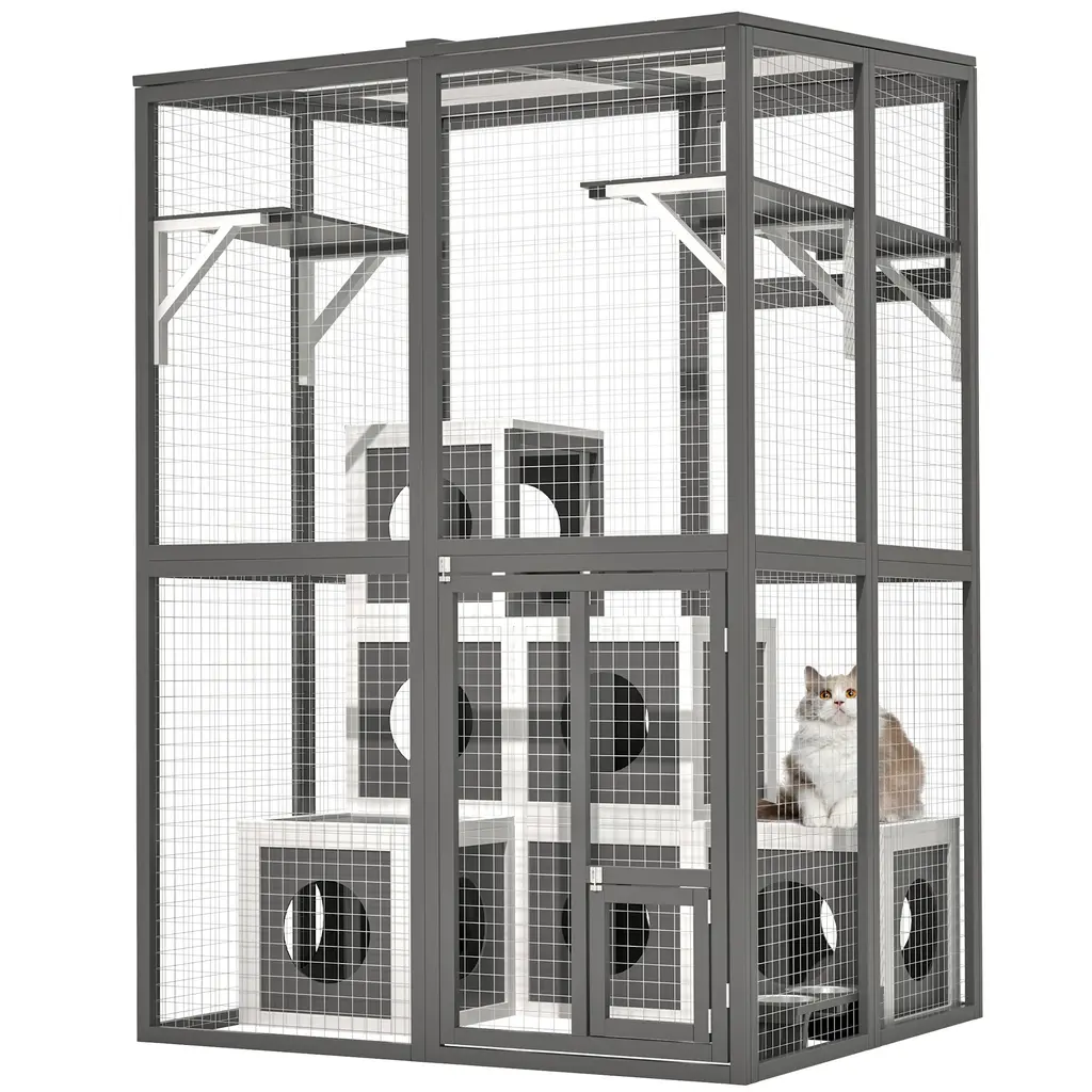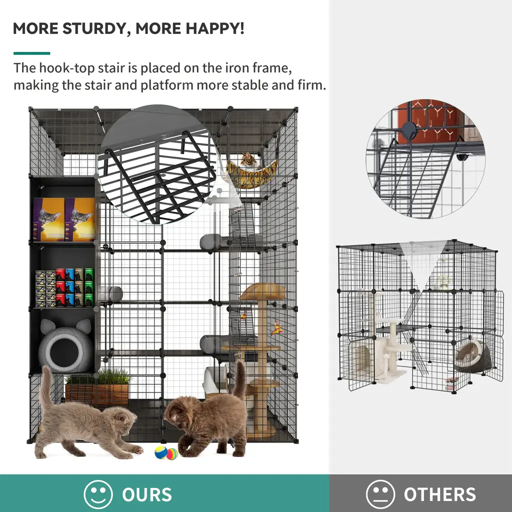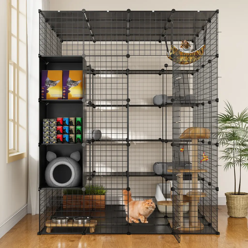 Large Cat Cage With Storage Cube Diy Indoor Catio Metal Cat Playpen With Hammock Platforms For 1-4 Cats 5 Tiers Cat Kennel - Black