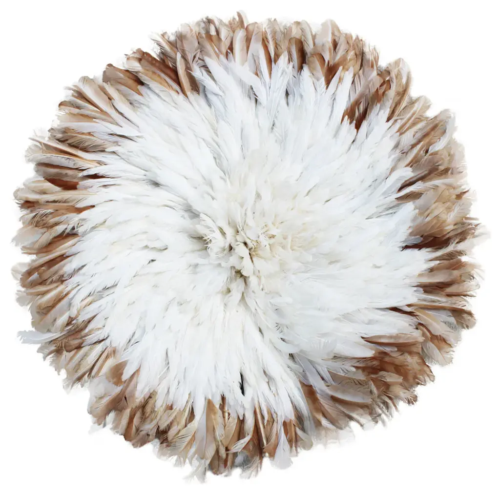 Origin: CameroonDimension: 29-31 inches/74-81 cm diameter.Profile dimension from wall surface (when open and suspend): approx. 5 inches (13 cm).Colors may differ slightly from photos due to different monitor settings. Also, the color may vary from one product to another due to the dye on feathers.Materials: Raffia wood, Hens feathers, fabric, plastic string, dyes for color.Imported. All Juju Hats have been fumigated before importation.Maintenance: Juju Hats need some love too. To maintain a beautiful Juju a little maintenance is necessary. Spray the feathers every 3 to 4 months with an anti-moth to prevent from any damages caused by insects. To remove the dust on the Juju, use a hair blow dryer on low temperature. Keep blow dryer at least 12 inches (or 30 cm) away from the feathers. If needed rearrange the feathers with your fingers.This artful Juju Hat, the Tyn Hat was handcrafted in Cameroon. For centuries, Bamiléké tribes have been making those hats that symbolize prosperity and freedom. Once, Juju Hats were worn by medicine men and royalties during tribal ceremonies. Nowadays, their customs are less restricted during Bamiléké traditional rituals and their beauty has reached homes beyond Cameroon"™s borders. Those headdresses are very impressive hung on walls. Juju hats are made from natural or dyed feathers and woven raffia. Artisans take 2 to 3 days to complete one hat.