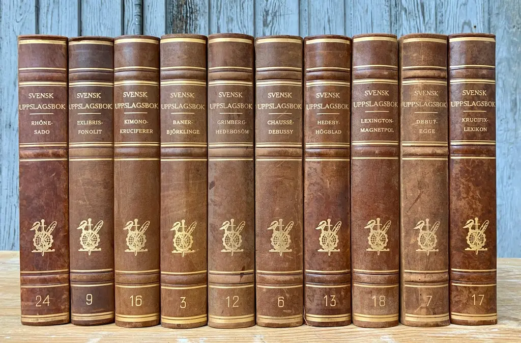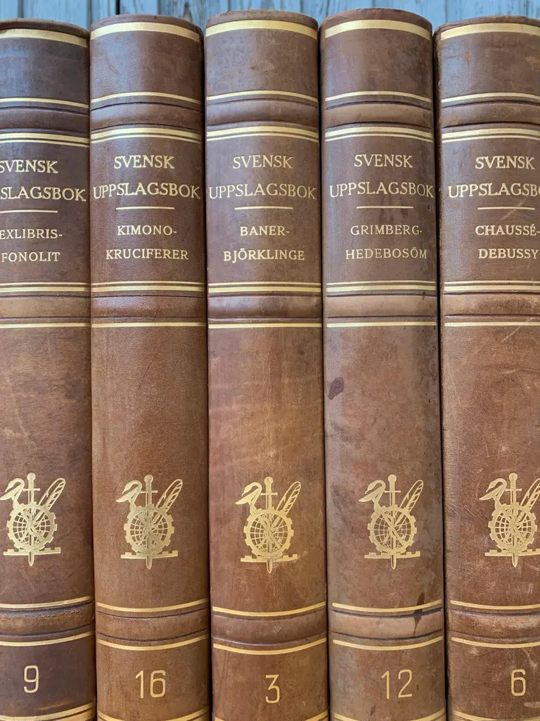 A collection of 15 sets of 10 large tall-size decorative Swedish leather-bound books from the 1950s.