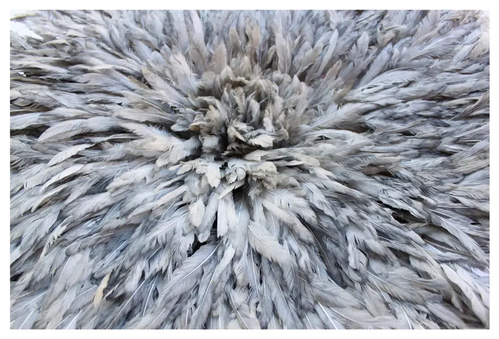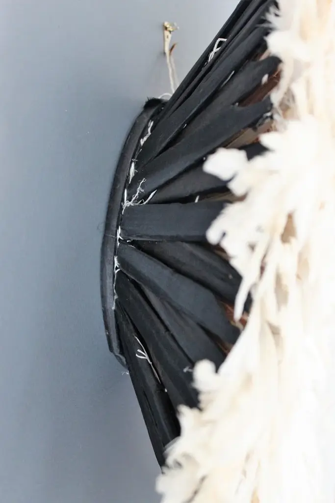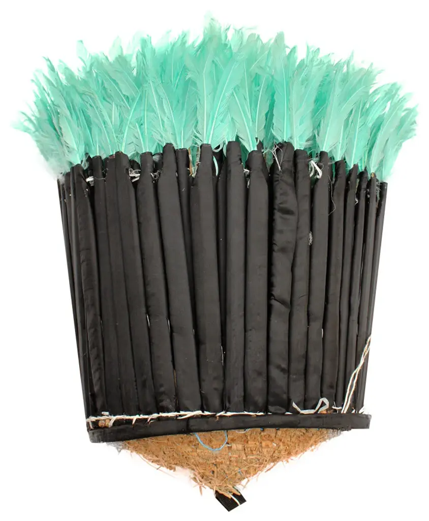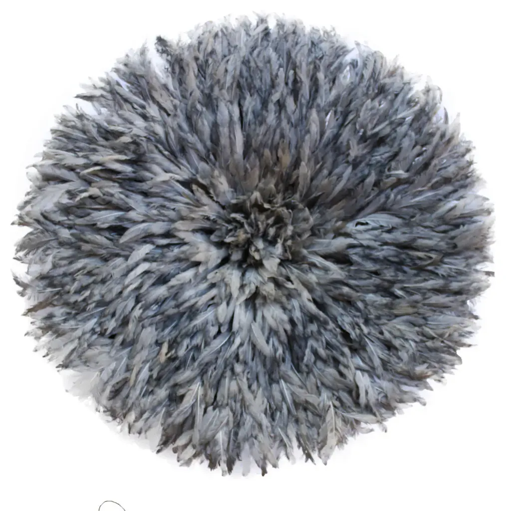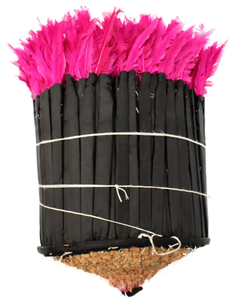 Origin: CameroonDimension: 29 to 31 Inch Profile dimension from wall surface (when open and suspend): approx. 6 inches (15 cm).Color may differ slightly from photos due to different monitor settings. Also, the color may vary from one product to another due to the dye on feathers.Materials: Raffia wood, Hens feathers, fabric, plastic string, dyes for color.Imported. All Juju Hats have been fumigated before importation.Maintenance: Juju Hats need some love too. To maintain a beautiful Juju a little maintenance is necessary. Spray the feathers every 3 to 4 months with an anti-moth to prevent from any damages caused by insects. To remove the dust on the Juju, use a hair blow dryer on low temperature. Keep blow dryer at least 12 inches (or 30 cm) away from the feathers. If needed rearrange the feathers with your fingers.This artful Juju Hat, the Tyn Hat is handcrafted in Cameroon. For centuries, Bamil tribes have been making those hats that symbolize prosperity and freedom. Once, Juju Hats were worn by medicine men and royalties during tribal ceremonies. Nowadays, their customs are less restricted during Bamil traditional rituals and their beauty has reached homes beyond Cameroon, borders. Those headdresses are very impressive hung on walls. Juju hats are made from natural or dyed feathers and woven raffia. Artisans take 2 to 3 days to complete one hat.