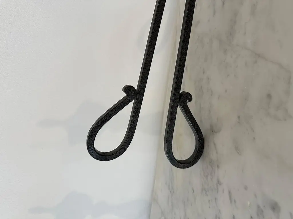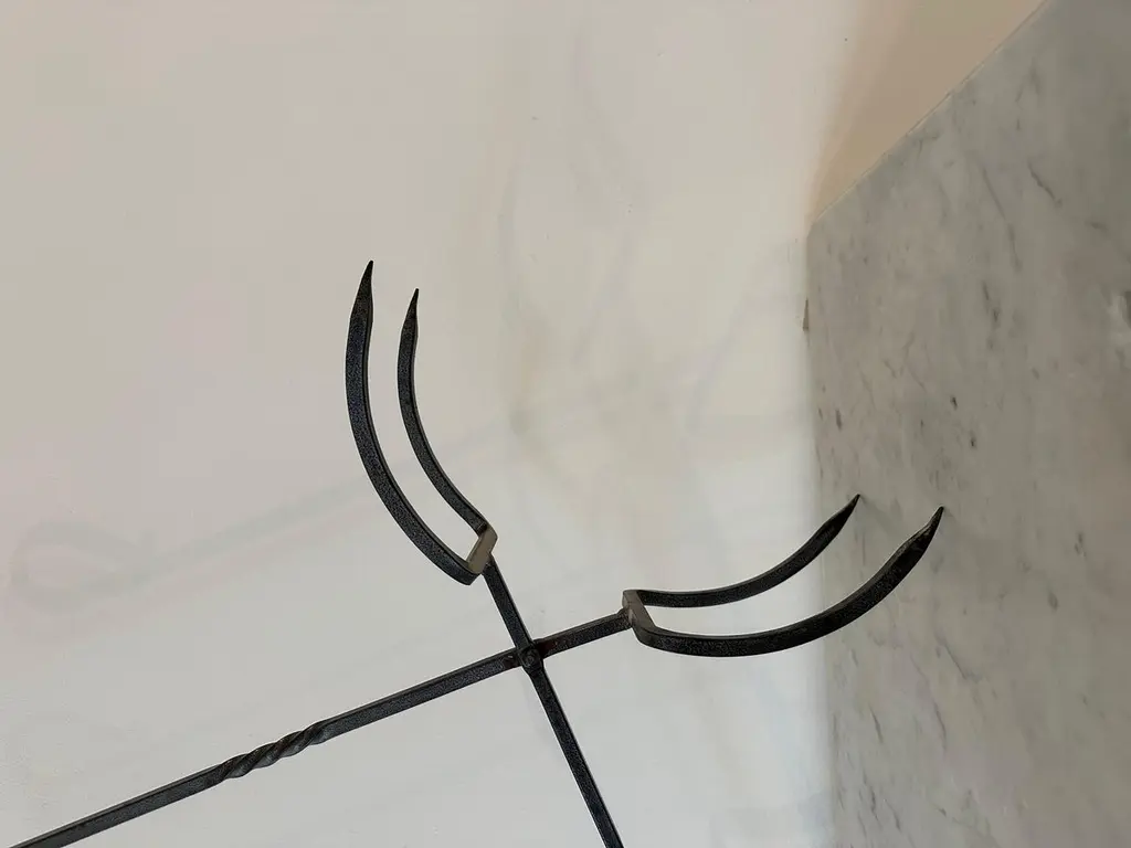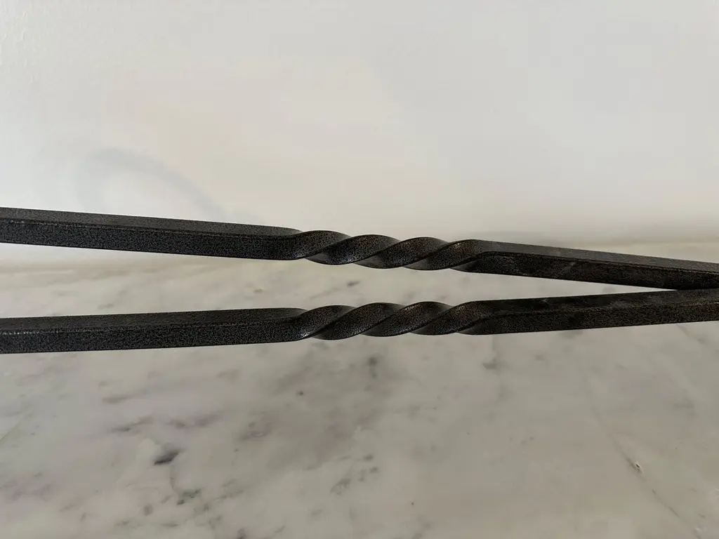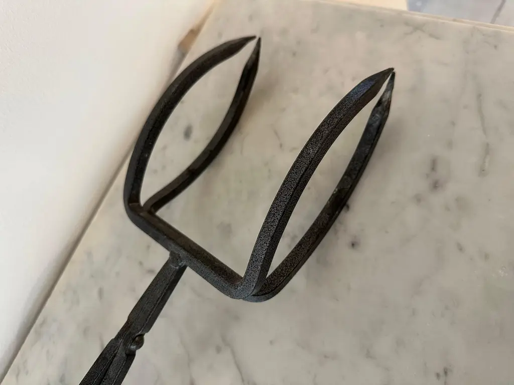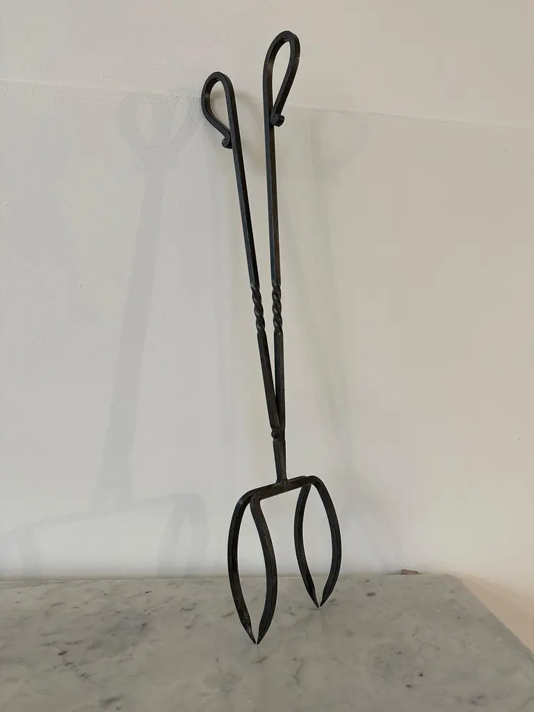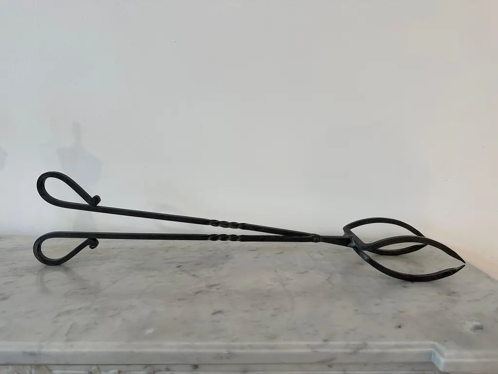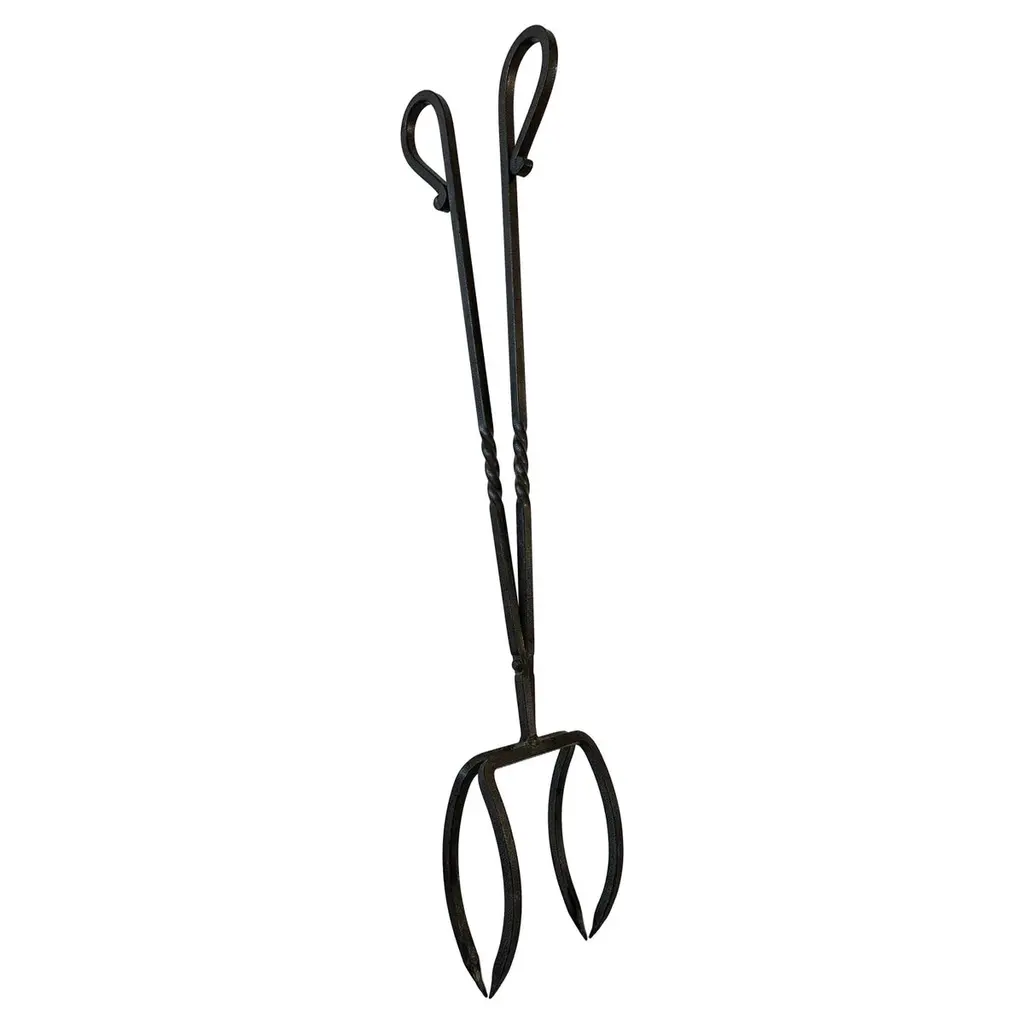 Nice large and tall unusually decorated fire tongs.Great decorative piece, very sturdy and suitable for handling big fire logs.