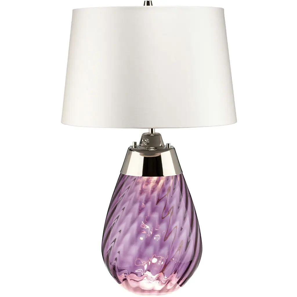Small wavy texture blown glass table lamp with a Plum tint and Polished Nickel metalwork. Fitted with a 4-way switch to light both the shade and the base. Fitted with Off White Smooth Satin Shade.