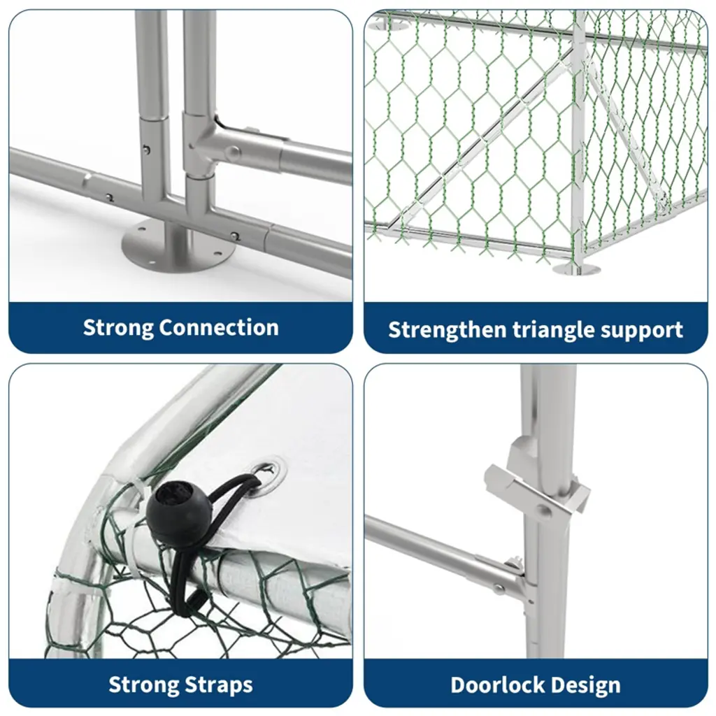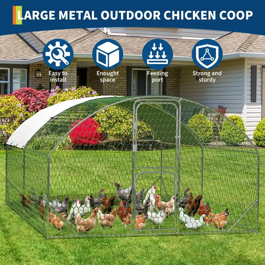 Walk-In Chicken Coop with Reinforced Dome - Large Outdoor Animal Enclosure for PoultryProduct Details:1. Reinforced Structural Stability SystemEngineered with heavy-duty galvanized steel frames and protective hexagonal mesh, this animal enclosure features innovative triangular reinforcement ribs at all critical stress points. The dome-shaped design with corner bracing provides exceptional structural integrity, ensuring superior resistance against harsh weather conditions and predator threats while maintaining long-term durability.2. Upgraded Dual-Access Security DoorsThe innovative double-door system revolutionizes animal care with separate access points for feeding and full entry. The top half-door allows convenient feeding without escape risks, while the full-size door provides easy human access for cleaning and maintenance. Both doors feature secure locking mechanisms and predator-proof latches for complete peace of mind.3. Quick-Connect Assembly TechnologyExperience remarkably straightforward installation with our patented quick-connection system. The precisely engineered components snap together effortlessly, eliminating complicated tools or frustrating assembly processes. What traditionally takes hours now takes minutes, allowing you to provide immediate shelter for your animals with minimal effort and maximum structural reliability.4. All-Weather Protective CanopyThe premium waterproof and UV-resistant cover creates a complete environmental barrier against rain, snow, and sun damage. The reinforced fabric membrane maintains a dry, comfortable habitat year-round while preventing moisture buildup and protecting against harmful ultraviolet radiation. Your animals enjoy optimal comfort regardless of seasonal weather changes.5. Multi-Species Versatile HabitatDesigned as a comprehensive animal sanctuary, this spacious 118"L x 157"W x 79"H enclosure accommodates diverse species including chickens, ducks, geese, rabbits, and small livestock. The generous walk-in height facilitates easy human access for care and maintenance, while the secure environment ensures animal safety and comfort in various outdoor settings.Specifications:? Structure: Galvanized Steel Frame with Hexagonal Mesh? Design: Dome with Reinforcement Ribs? Product Dimensions: 118.11"L x 157.48"W x 78.74"H? Special Feature: Lockable Double Door System? Weather Protection: Waterproof & UV-Resistant Cover? Assembly: Quick-Connect Component System? Applications: Poultry, Small Livestock, Multiple Animal Species? Use: Outdoor Farms, Backyards, Homesteads? Included: All-Weather Cover, Assembly Hardware, Locking Mechanisms