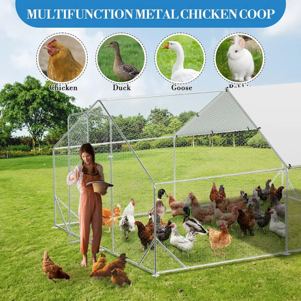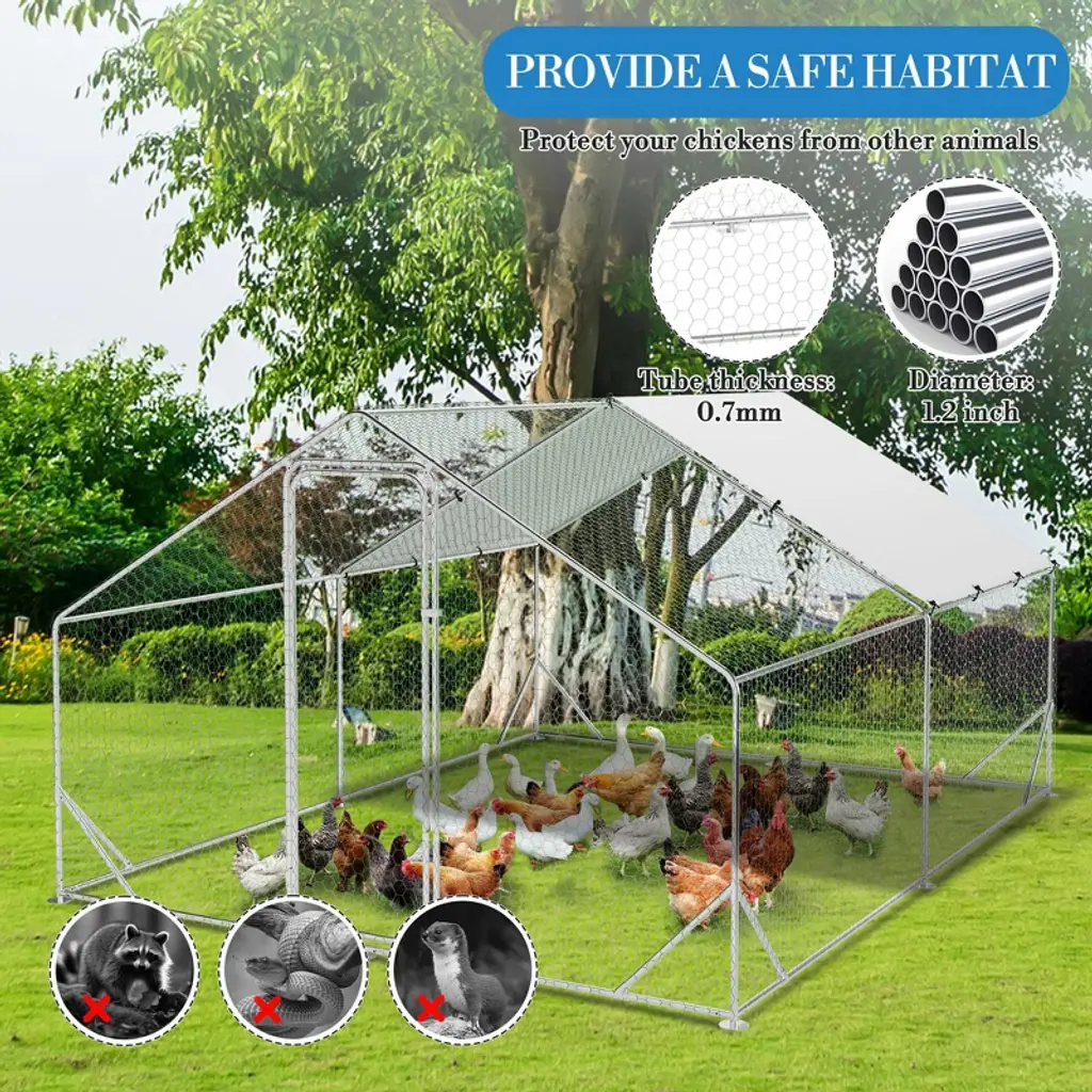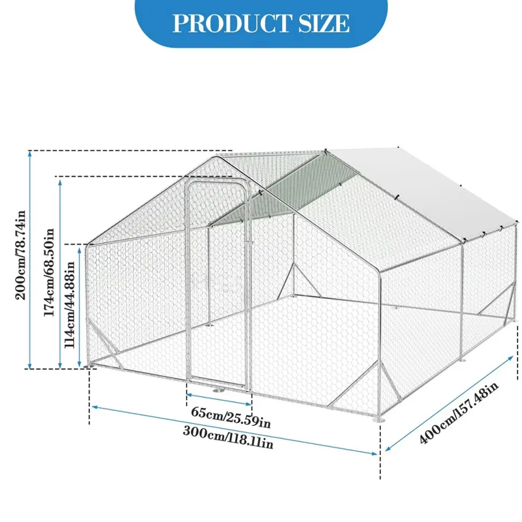 Name: Heavy-Duty Galvanized Metal Chicken Coop with Waterproof CoverMaterial:Frame: Upgraded galvanized steel pipes (0.8mm thickness, stronger than standard 0.6mm)Walls: PVC-coated hexagonal wire mesh (anti-escape, enhanced safety)Roof: Waterproof & UV-resistant PE tarp (spire design for rain/snow runoff)Door: Lockable metal latch for secure accessCapacity (5 Size Options): Small: 9.8×6.5×6.5 ftMedium: 9.8×13.1×6.6 ftLarge: 9.8×19.7×6.6 ft120×40×40 in160×40×40 in Packing List:1xMetal Chicken Coop1xInstruction Manual1xAssembly Kit