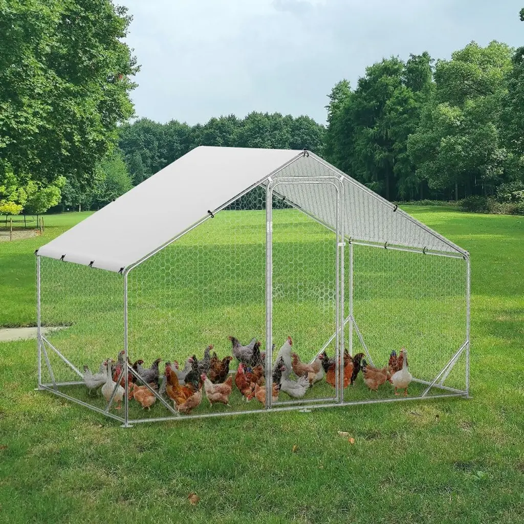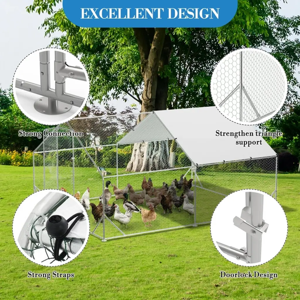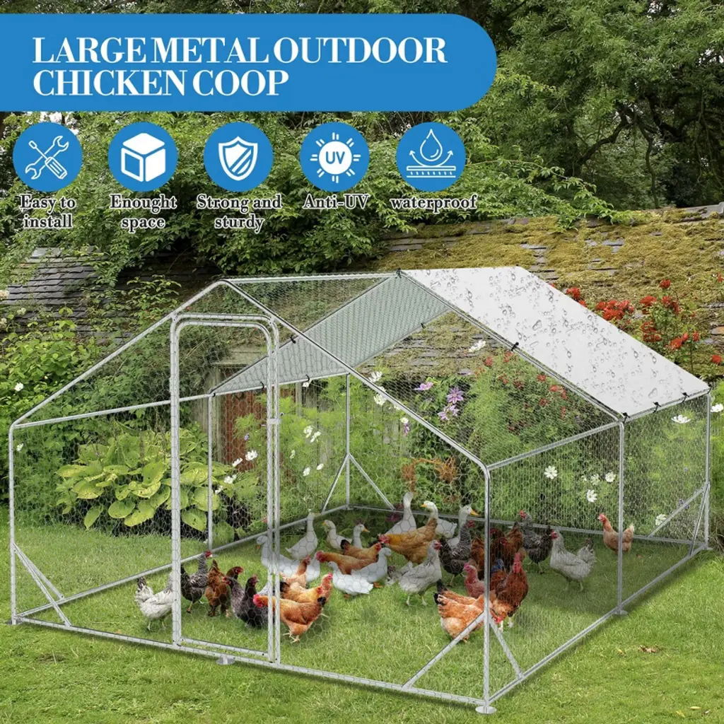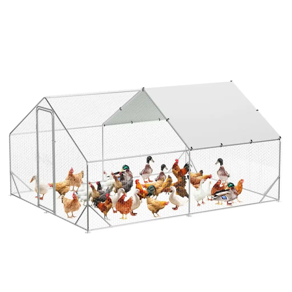 Name: Heavy-Duty Galvanized Metal Chicken Coop with Waterproof CoverMaterial:Frame: Upgraded galvanized steel pipes (0.8mm thickness, stronger than standard 0.6mm)Walls: PVC-coated hexagonal wire mesh (anti-escape, enhanced safety)Roof: Waterproof & UV-resistant PE tarp (spire design for rain/snow runoff)Door: Lockable metal latch for secure accessCapacity (5 Size Options): Small: 9.8×6.5×6.5 ftMedium: 9.8×13.1×6.6 ftLarge: 9.8×19.7×6.6 ft120×40×40 in160×40×40 in Packing List:1xMetal Chicken Coop1xInstruction Manual1xAssembly Kit