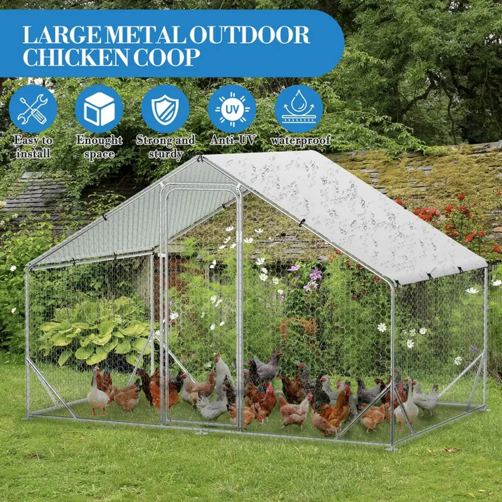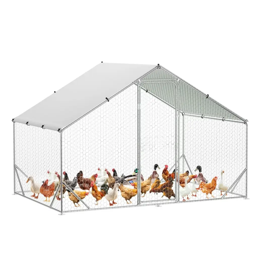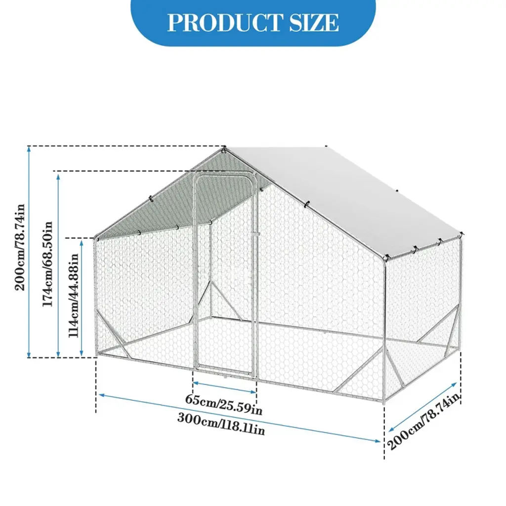 Name: Heavy-Duty Galvanized Metal Chicken Coop with Waterproof CoverMaterial:Frame: Upgraded galvanized steel pipes (0.8mm thickness, stronger than standard 0.6mm)Walls: PVC-coated hexagonal wire mesh (anti-escape, enhanced safety)Roof: Waterproof & UV-resistant PE tarp (spire design for rain/snow runoff)Door: Lockable metal latch for secure accessCapacity (5 Size Options): Small: 9.8×6.5×6.5 ftMedium: 9.8×13.1×6.6 ftLarge: 9.8×19.7×6.6 ft120×40×40 in160×40×40 in Packing List:1xMetal Chicken Coop1xInstruction Manual1xAssembly Kit