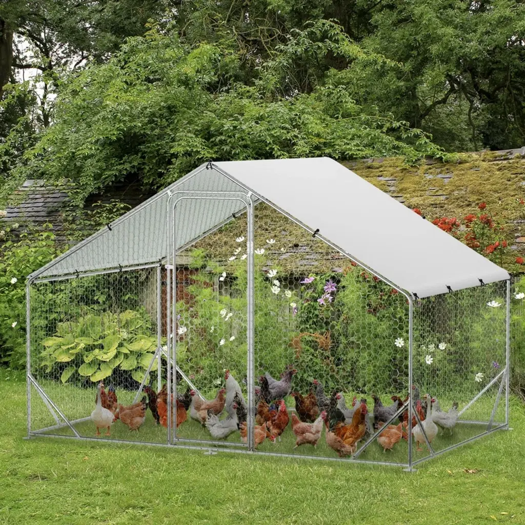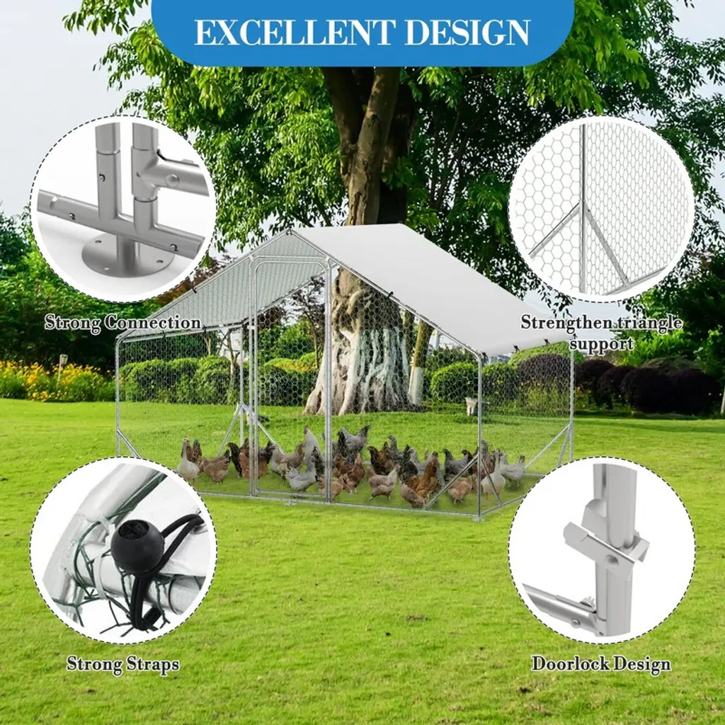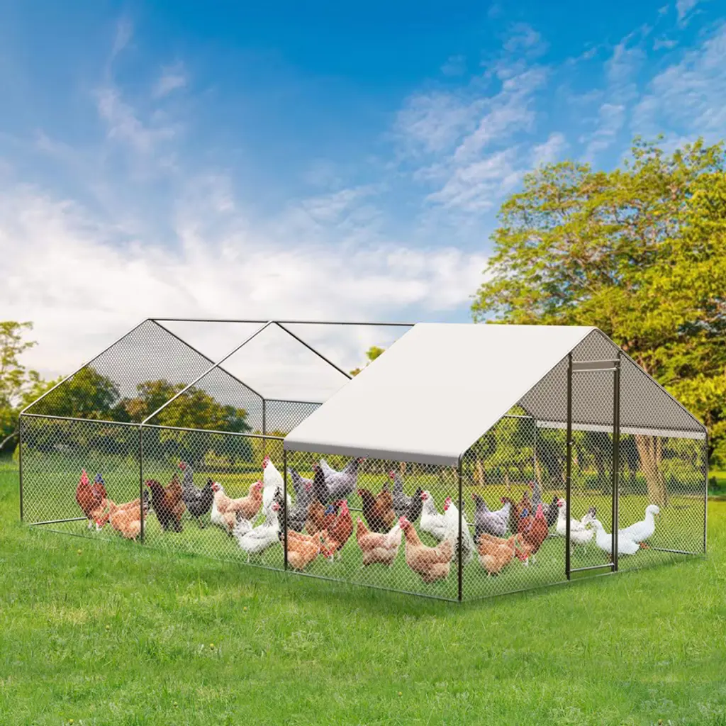 Name: Heavy-Duty Galvanized Metal Chicken Coop with Waterproof CoverMaterial:Frame: Upgraded galvanized steel pipes (0.8mm thickness, stronger than standard 0.6mm)Walls: PVC-coated hexagonal wire mesh (anti-escape, enhanced safety)Roof: Waterproof & UV-resistant PE tarp (spire design for rain/snow runoff)Door: Lockable metal latch for secure accessCapacity (5 Size Options): Small: 9.8×6.5×6.5 ftMedium: 9.8×13.1×6.6 ftLarge: 9.8×19.7×6.6 ft120×40×40 in160×40×40 in Packing List:1xMetal Chicken Coop1xInstruction Manual1xAssembly Kit